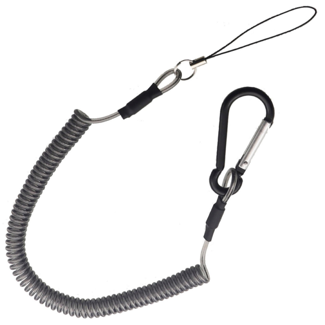 携帯電話や鍵、工具等を落下や紛失から守る。カラビナフック付きで作業用ベルトやベルト通しに取付可能。