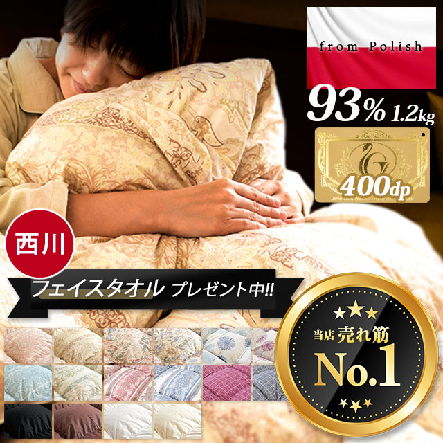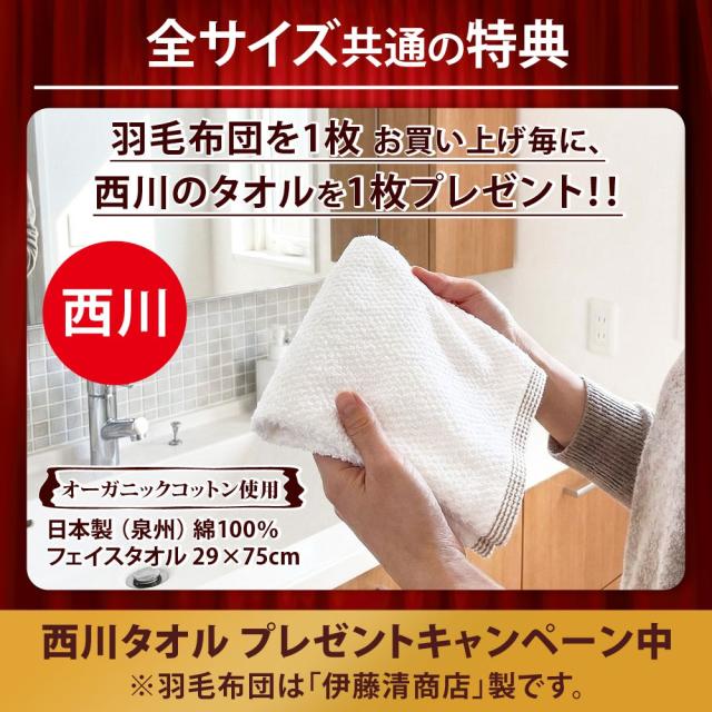 【2/23 20時〜ご利用1時間限定10%offクーポン対象】羽毛布団 シングル ロング 【西川 の フェイスタオル プレゼント】 ダウン93% ロイヤルゴールド 【7年保証】 威風堂々 日本製 ホワイトダック ポーランド産 1.2kg ダウンパワー400dp以上 150×210 羽毛ふとん