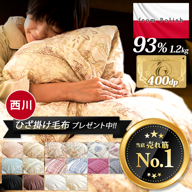 【1/3 20時〜ご利用1時間限定10%offクーポン対象】羽毛布団 シングル ロング 【西川 の 毛布 (ひざ掛け) プレゼント】 ダウン93% ロイヤルゴールド 【7年保証】 威風堂々 日本製 ホワイトダック ポーランド産 1.2kg ダウンパワー400dp以上 150×210 羽毛ふとん