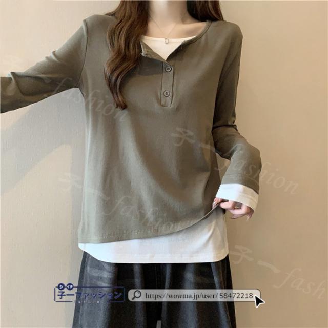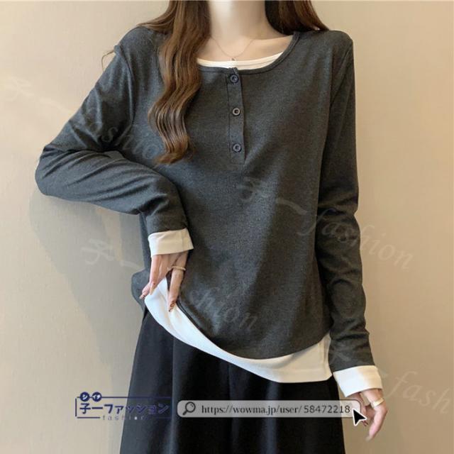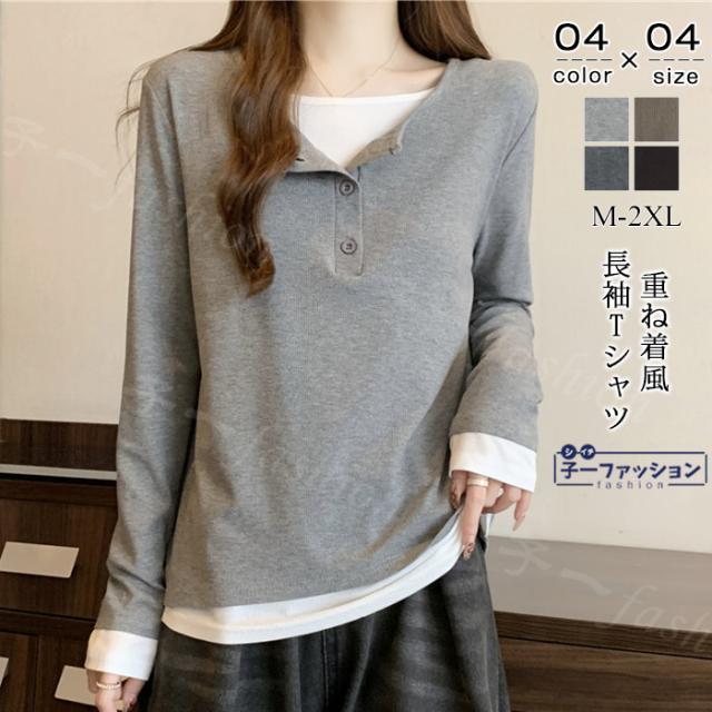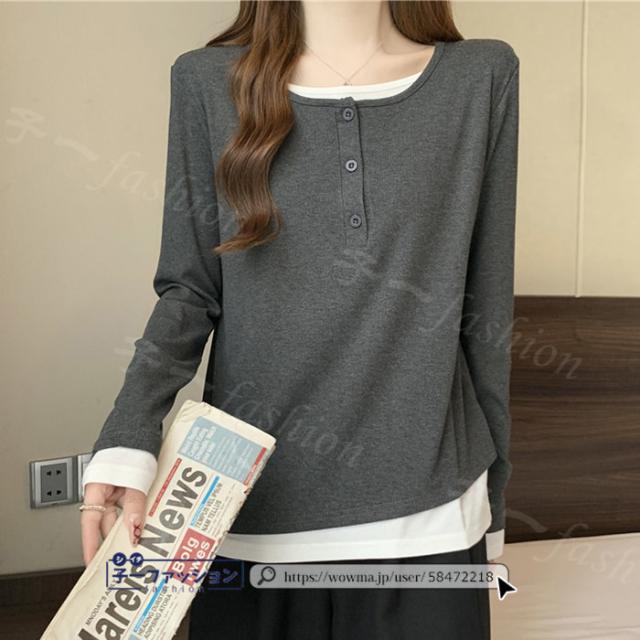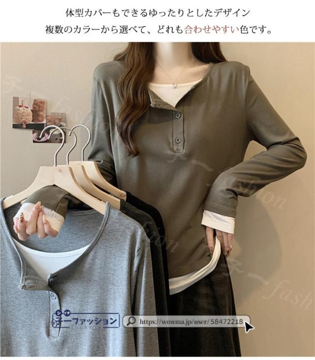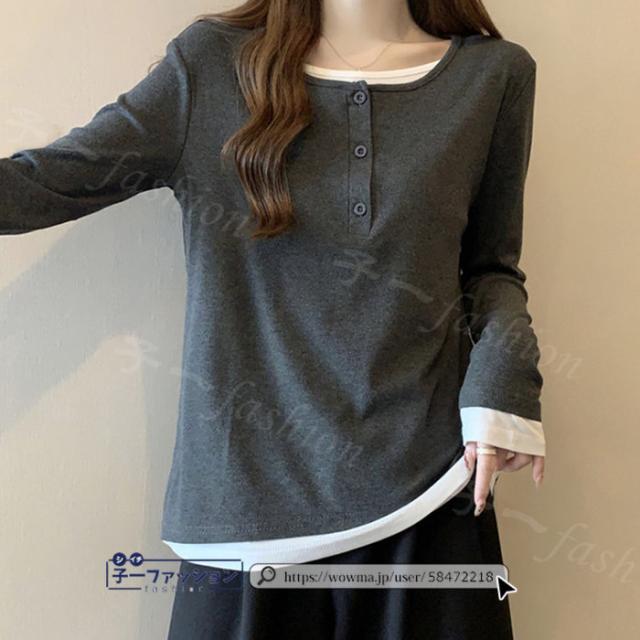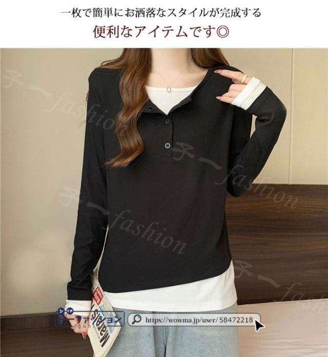 tシャツ レディース 長袖 重ね着風 春新作 新作 送料無料 綿混 ロンT Tシャツ トップス ゆったり ロンT フェイクレイヤード 重ね着風長袖Tシャツ ボタン付き オーバーサイズ ロング 春秋 カットソー 体型カバー 秋冬 バレンタイン