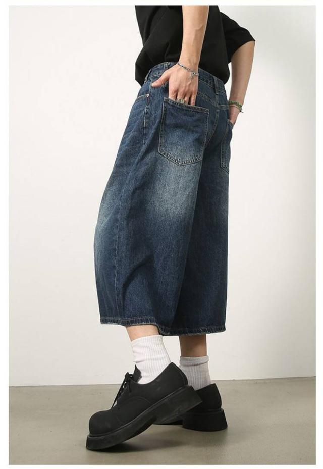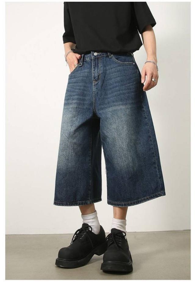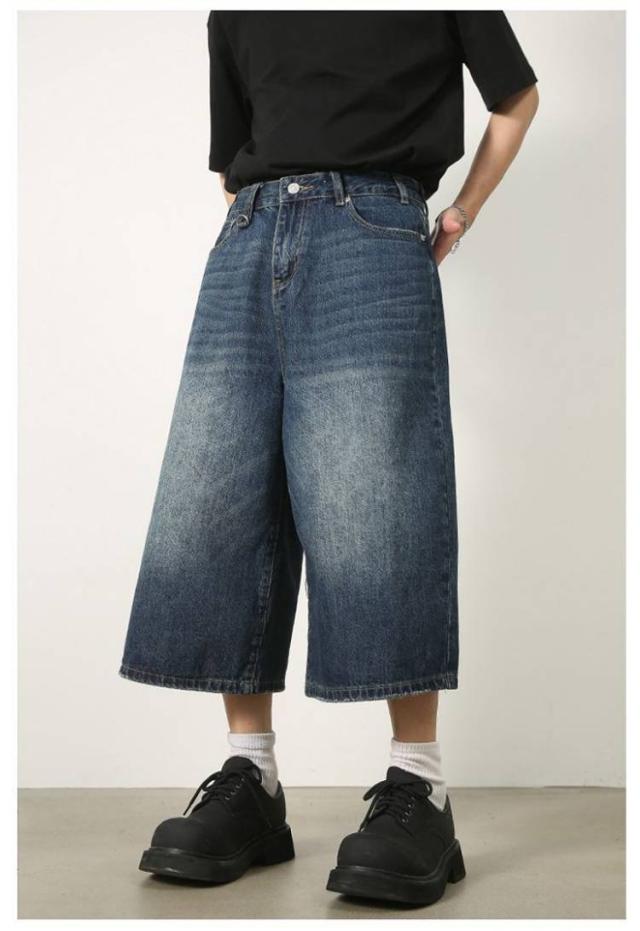 デニムパンツ 7分丈 ショートパンツ ハーフパンツ メンズ ジーンズ ジーパン ワイドパンツ ヴィンテージ風 膝下 ひざ下 クロップドパンツ ストリート系 ヒップホップ 個性派 衣装 おしゃれ カッコイイ 大きいサイズ 体型カバー カジュアル 送料無料