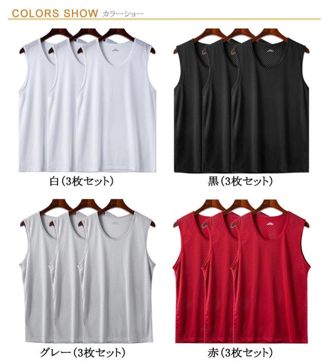 3枚セット!ノースリーブ タンクトップ メンズ 袖なし tシャツ 夏服 スポーツ インナー メッシュ アンダーウェア インナーシャツ 接触冷感 通気速乾 薄手 肌着 レイヤード 重ね着 スポーツ トレーニング ランニング ゴルフ 野球 バイク