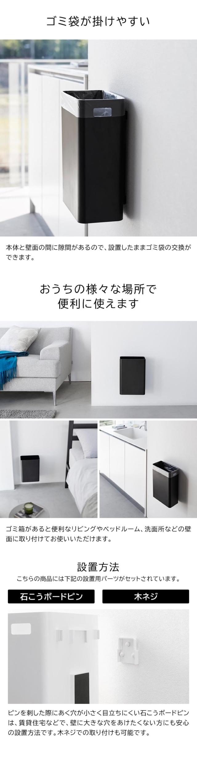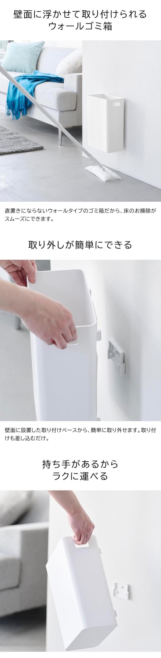 リビングやベッドサイド、洗面所などの壁面に浮かせて設置できるゴミ箱です。付属の石こうボードピンか木ネジで取り付けベースを壁面に付け、本体を差し込むだけで簡単に設置可能。ゴミが溜まったら簡単に取り外してラクに持ち運べます。浮かせて設置することで床のお掃除もスムーズです。
