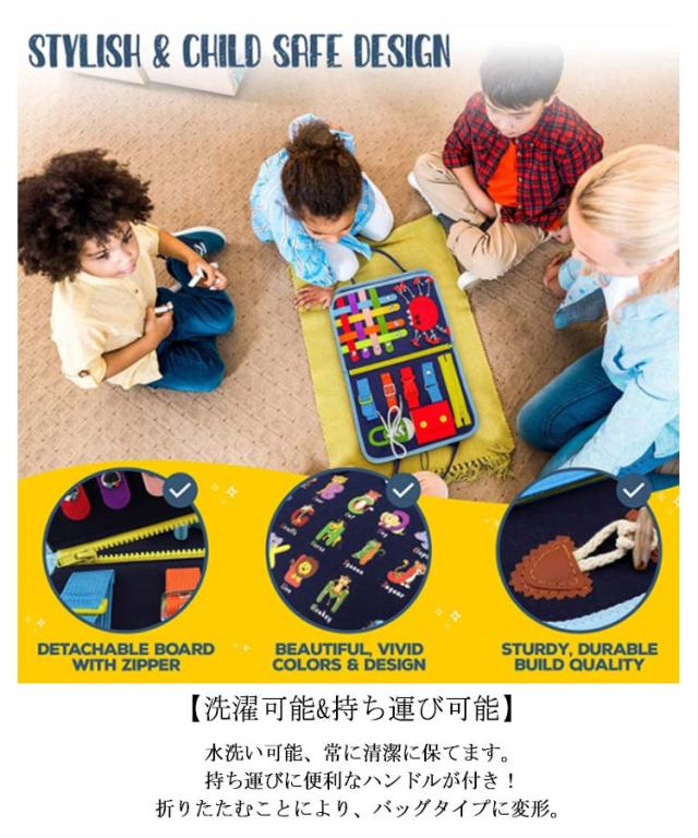 | ビジーボードはモンテッソーリ教育に基づいた子供の才能を伸ばす知育おもちゃです。 【豊かな内容】 ボタン、バックル、靴紐、ジッパー、パズルなどで遊べます。 アルファベット、カラー、算数、形状の意識を確かめながら、基本的な概念を自然に学ぶことができます。 【指先の鍛錬に】 紐を引っ張ったり、チャックを開けたり、様々な動作が可能で、お子様の問題解決力や探究心を育てます。 つなぐ、はずすを繰り返し、指先を動かすことで脳の活性化に繋がります。 【お着替えの練習に】 衣類のよく使われている留め具、ボタンなどを網羅しており、お子様のお着替えの練習に役立ちます。 【洗濯可能&持ち運び可能】 水洗い可能、常に清潔に保てます。 持ち運びに便利なハンドルが付き!折りたたむことにより、バッグタイプに変形。 【プレゼントに最適】 鮮やかな色がお子様の注目を集め、お子様を長くおもてなしいたします。 誕生日、クリスマス、または子供たちへのサプライズギフトとして最適です。 | |