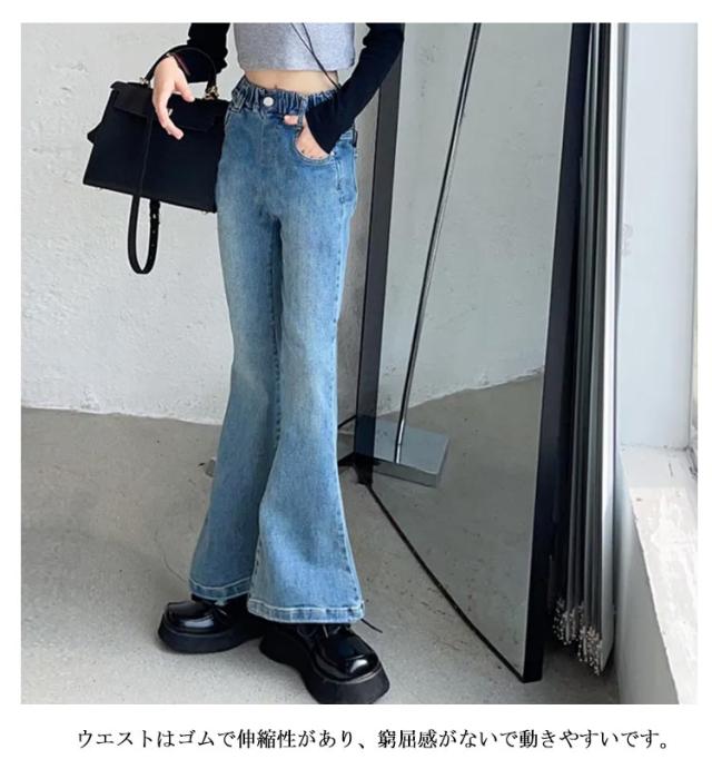 | シンプルなデザインで、着回し上手な定番ジーンズ 程よいフィット感で動きやすさと脚長効果の両立! 裾に向かってフレアデザインが可愛い♪ ウエストはゴムで伸縮性があり、窮屈感がないで動きやすいです。 普段着はもちろん、ダンス衣装としてもおすすめ。 | |