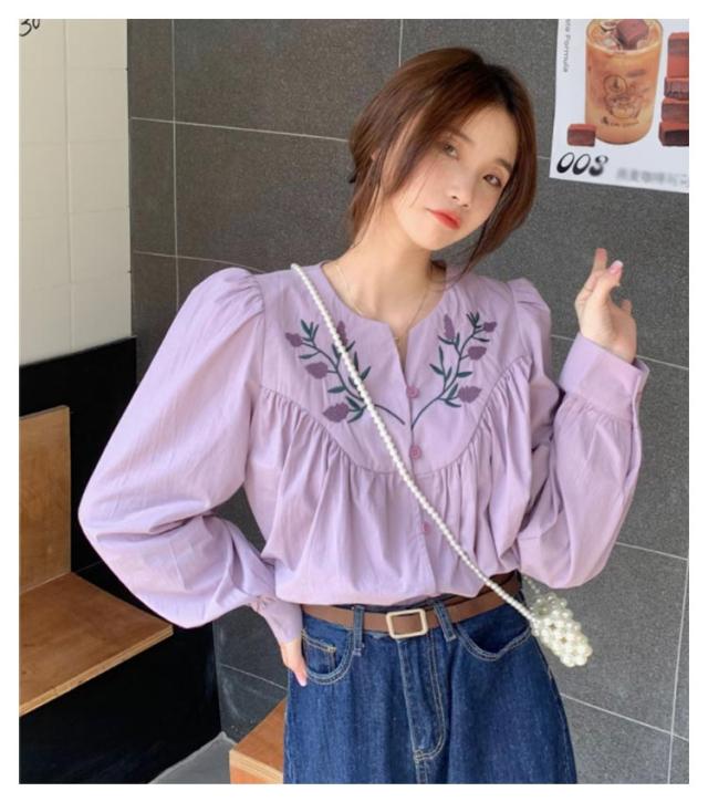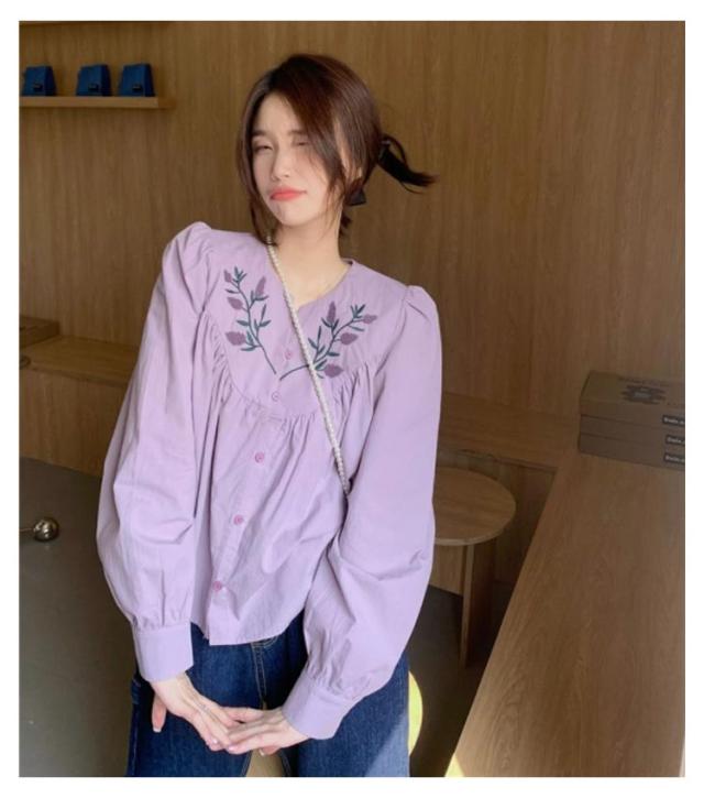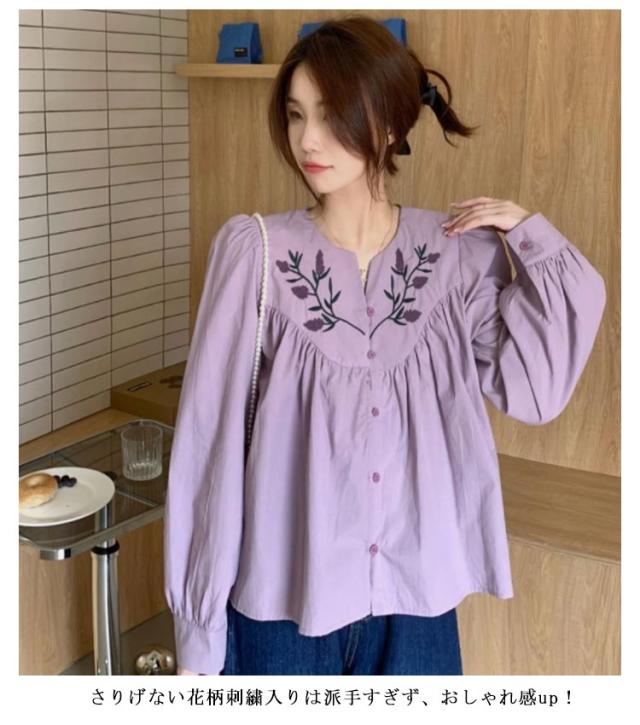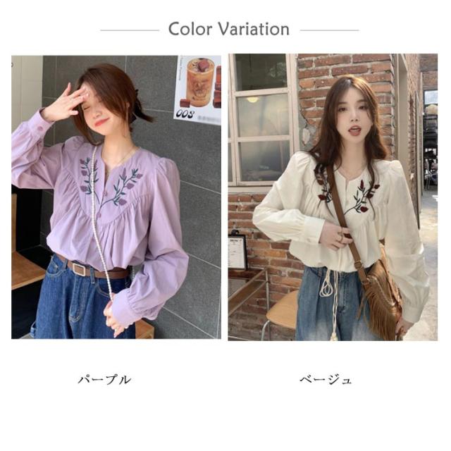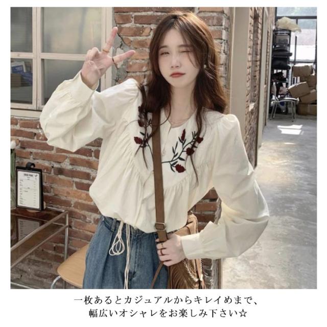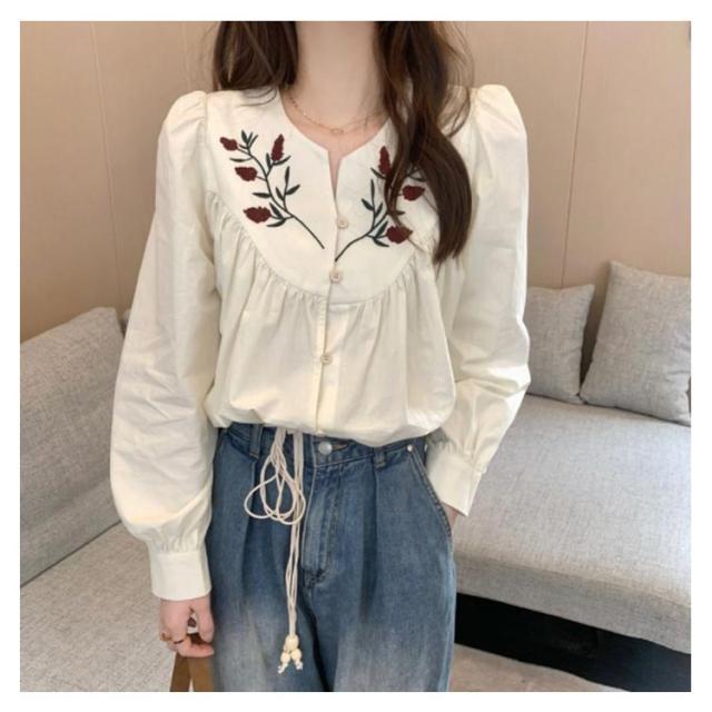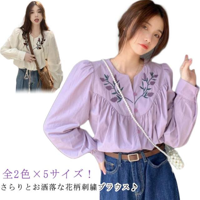 花柄刺繍ブラウス ブラウス トップス シャツ 長袖 パススリーブ 刺繍ブラウス カジュアルシャツ 春物 可愛い vネック トレロ 春服 花柄刺繍ブラウス 花柄