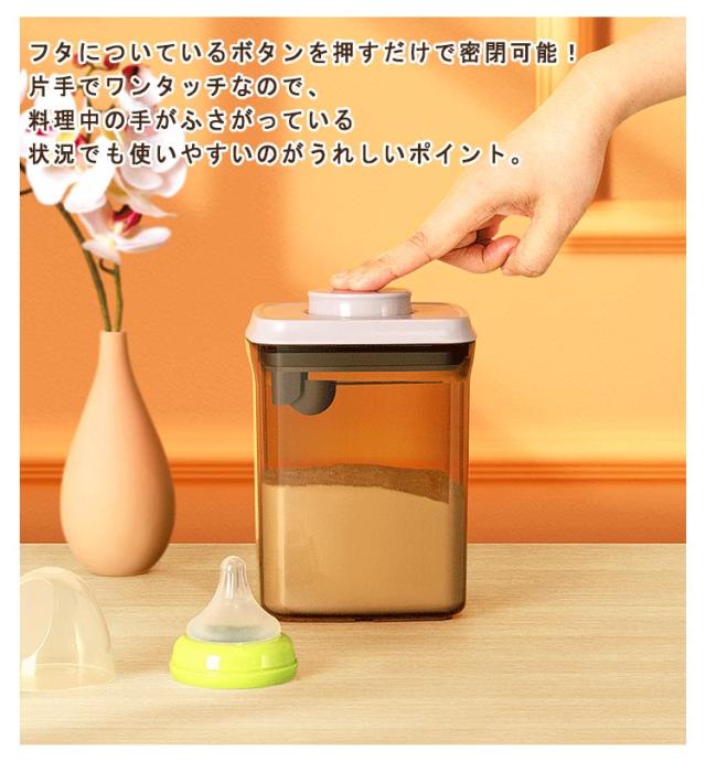 | 【7タイプ】粉ミルクやプロテインの長期保存に最適な容器 フタについているボタンを押すだけで密閉可能!片手でワンタッチなので、料理中の手がふさがっている状況でも使いやすいのがうれしいポイント。 クリアだけでなく、茶色のデザインは遮光効果があり粉ミルクの鮮度を保てます♪ フタ部分はスプーン収納所があり、サイズ違いスプーンにも対応できます。 コンパクトなサイズ、外遊びや旅行に大変便利なアイテムです。 粉ミルクだけでなく、米やナッツなどの保存容器としてもおすすめ。 | |