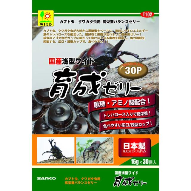 黒糖蜜。トレハロース。アミノ酸など、昆虫のエネルギー源を配合した、成虫用栄養ゼリー。浅型ワイドカップ仕様。浅型ワイドカップは、容量を一般的な16gに設定、容量カップの形状を、広口(ワイド)にし、尚且つ深さを設定しています。昆虫(カブト虫、クワガタ虫)が無理なく食べることができ、クワガタ虫のアゴがゼリーカップに突き刺さる事故も抑制します。食べ残しもなくなり、より経済的で衛生的に使用できます。