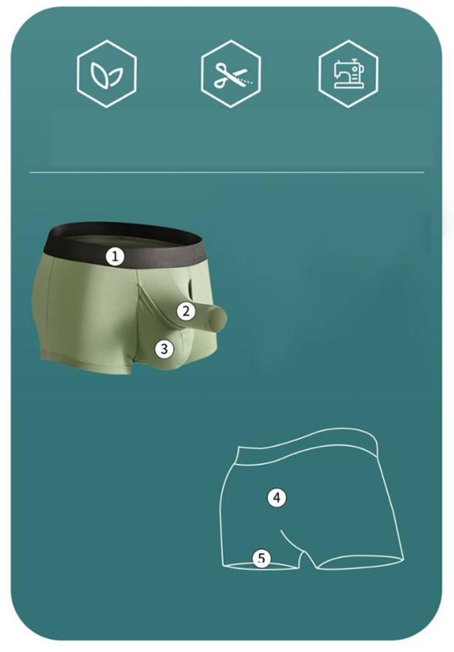 | 男性自身の形に沿ったゾウさん型のボクサーパンツです。 伸縮性の良い柔らかなストレッチ生地が、ボディラインや男性自身にピッチリとフィットします。 筒状の先端部分は開放タイプになっています。 | |