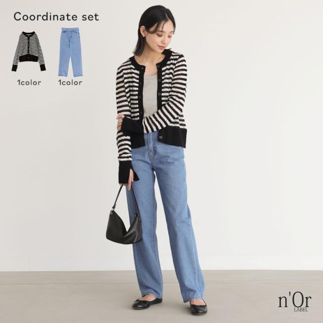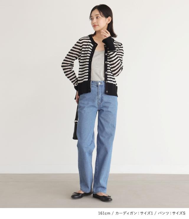 『透かし編みボーダー柄ニットカーディガン×ストレートデニムパンツコーデ2点SET』【メール便不可】【30】[2点コーデセット 2024 レディース ニット カーディガン トップス デニム パンツ ジーンズ デニムパンツ]
