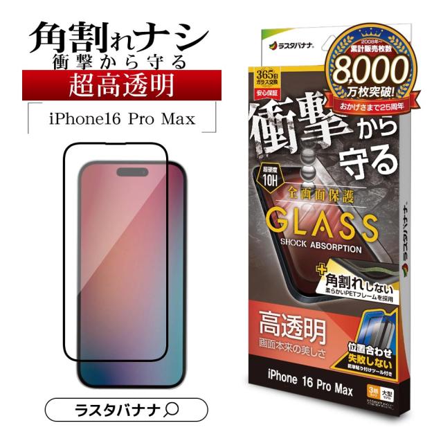 iPhone16 Pro Max ガラスフィルム 全面保護 高光沢 高透明 クリア 角割れしない 衝撃吸収 ガイド枠付き SGSA4473IP467P ラスタバナナ