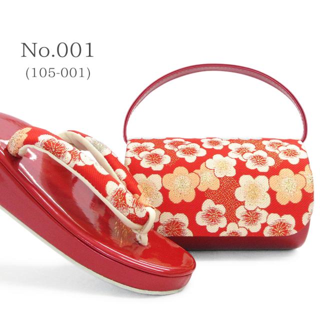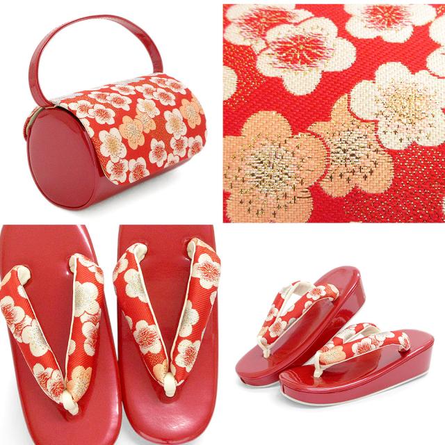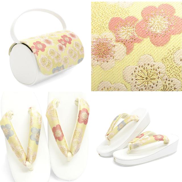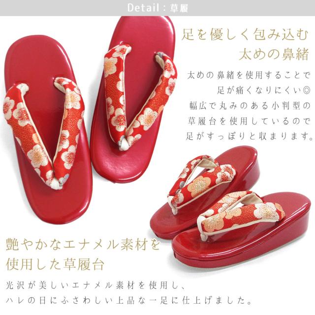 草履の鼻緒にはバッグとお揃いの金襴生地を使用し、統一感のあるコーディネートに◎