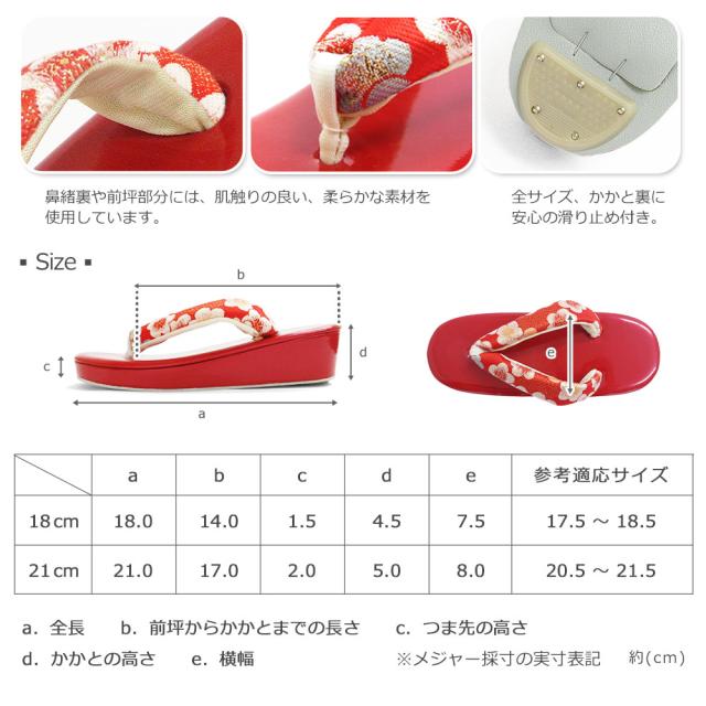 また足が痛くなりにくいよう、鼻緒にボリュームを持たせ、前坪部分には柔らかな生地を使用しています。