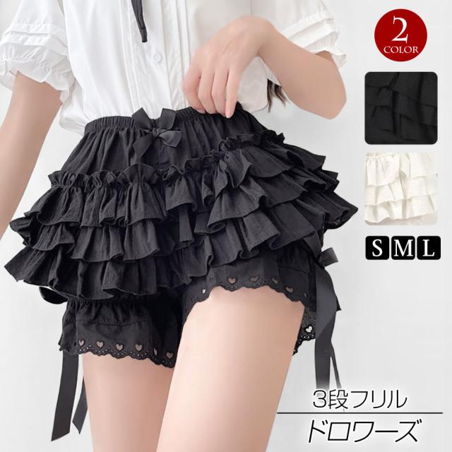 ■3段フリルと裾にハート柄のレースがついたドロワーズ♪ ■両サイドにリボンのついた可愛らしい見せパン♪♪ ■ウエストと裾部分はゴム仕様で着心地も快適! ■スカートが透けてしまう時、ふわふわなシルエットを作りたい時などに大活躍♪ ■ダンス衣装・ロリータ・メイド・パーティーコスチューム・ハロウィン衣装に◎ |