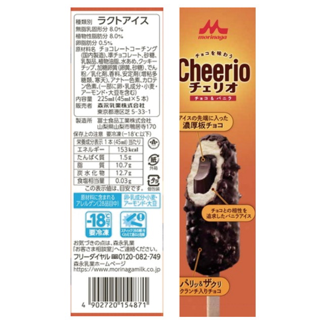 商品名 [アイス] 森永乳業 チェリオマルチ チョコ&バニラ 45ml×5本×8箱 容量 225ml×8個 原材料名 チョコレートコーチング(国内製造)、準チョコレート、砂糖、乳製品、植物油脂、水あめ、クッキーチップ、加糖卵黄(卵黄、砂糖)、でん粉/乳化剤、香料、安定剤(増粘多糖類、寒天)、アナトー色素、カロテン色素、