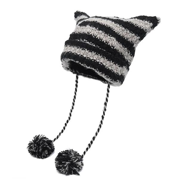 小さな悪魔のストライプのニットビーニーハット女性用 猫の耳の帽子 パンクゴシック 原宿 ファッションデザイナー 冬 2023