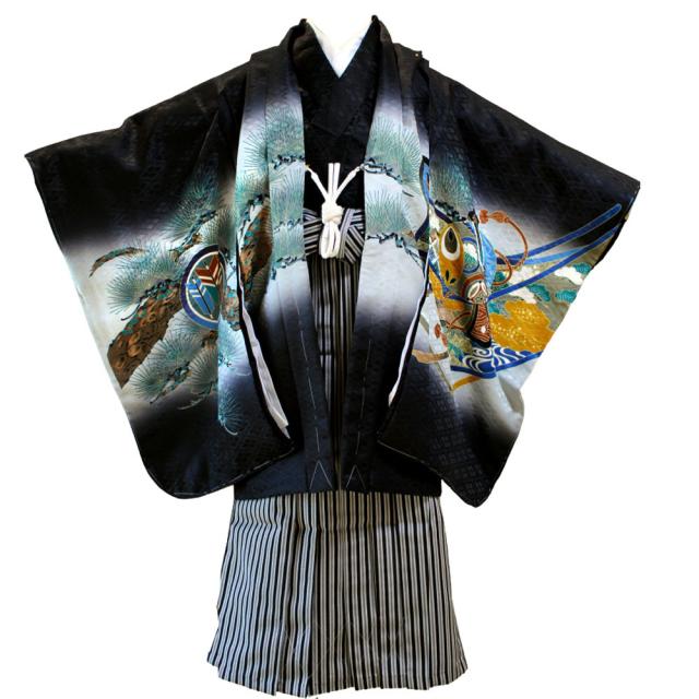 【レンタル】 七五三 着物 男の子 袴 5歳 13点 セット 五歳 袴 トータルセット 17(黒・兜に軍配) 【 紋付アンサンブル 着物 羽織 紋付 男の子 子供