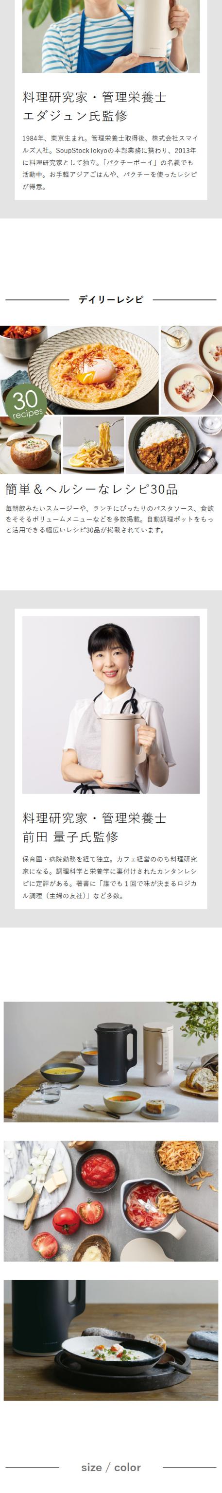 ほったらかしの加熱かくはん調理で大人気の「 recolte 自動調理ポット 」を、もっと便利に活用できるスペシャルな別売レシピブックが登場。『 スープレシピ 』は、旬を味わうさまざまなポタージュのほか、絶品のごちそうスープや植物性ミルクの作り方まで豊富な31品を掲載。『 デイリーレシピ 』は、朝食にぴったりのスムージー、ボリューム満点のミートソースやカレーなど日々の食卓に寄り添う30品が掲載されています。お好みに合わせてレシピブックの種類をお選びください。