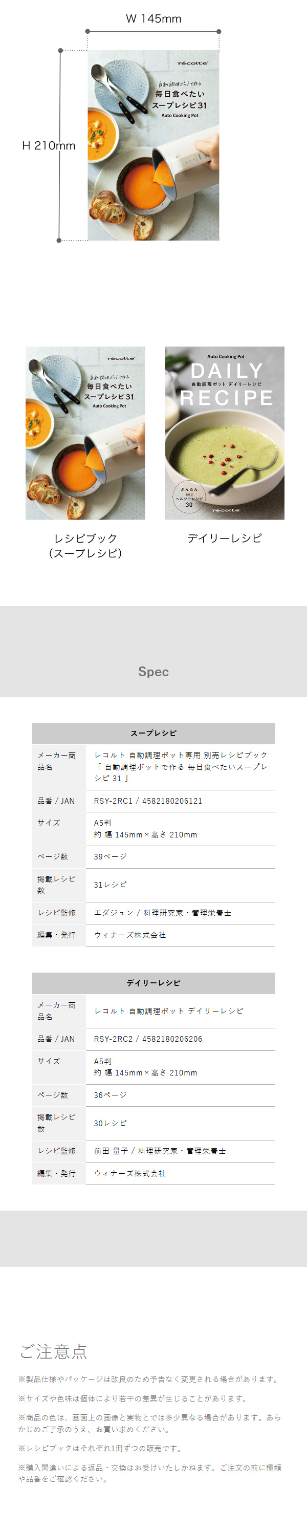 recolte自動調理ポットをもっと便利に活用できる、お客様のリクエストから生まれた別売レシピブック。「スープレシピ」と「デイリーレシピ」から1つをお選びいただけます。