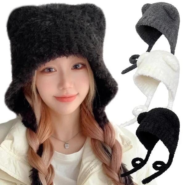 女性のためのかわいいクマの耳ニットウールの帽子 レースアップビーニー ボンバーキャップ ネット ニット ぬいぐるみ 韓国 暖かい 冬