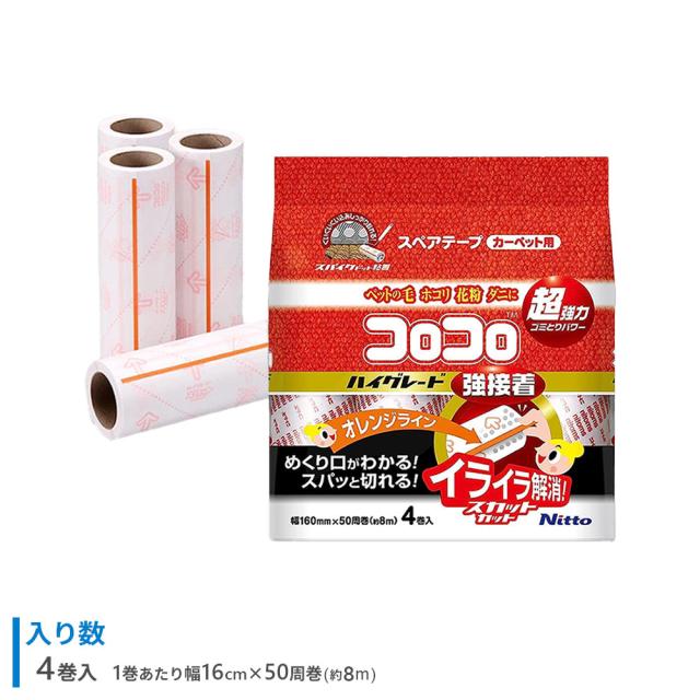 粘着クリーナー・コロコロシリーズ最上位タイプのカーペット用強接着交換テープ4巻入り。