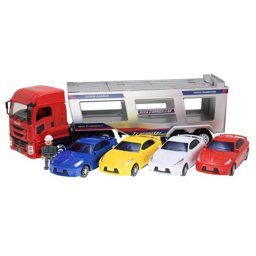 大型定番商品のキャリアカーが新車種のイスズギガでリニューアルしました。キャリアカーはフリクション走行の他、両ドアが開閉し付属の人形(1体)を運転席に座らせることが出来ます。その他、ヘッドとキャリアを切り離すことができ、キャリアはスロープが上下して車を下に降ろすことが出来ます。キャリアはスタンドで自立し大型のカラフルなミニカーが4台付属します。