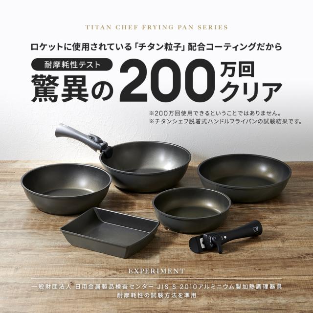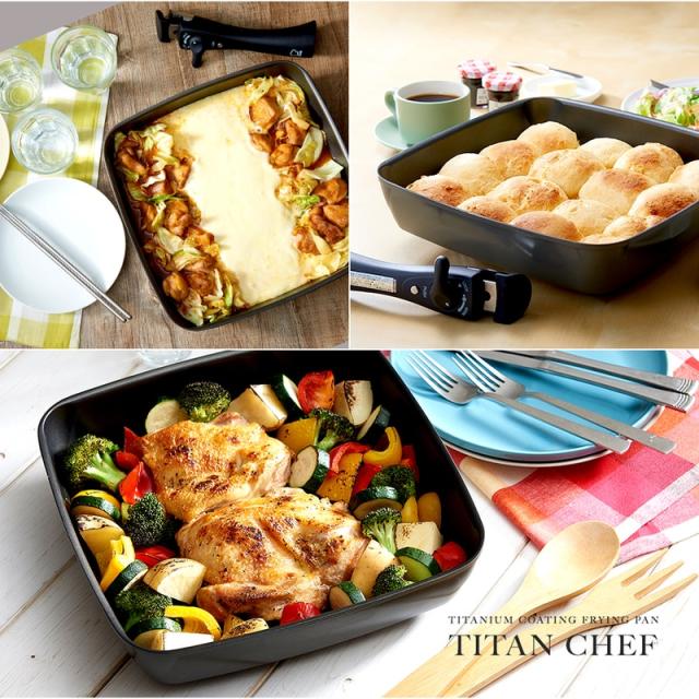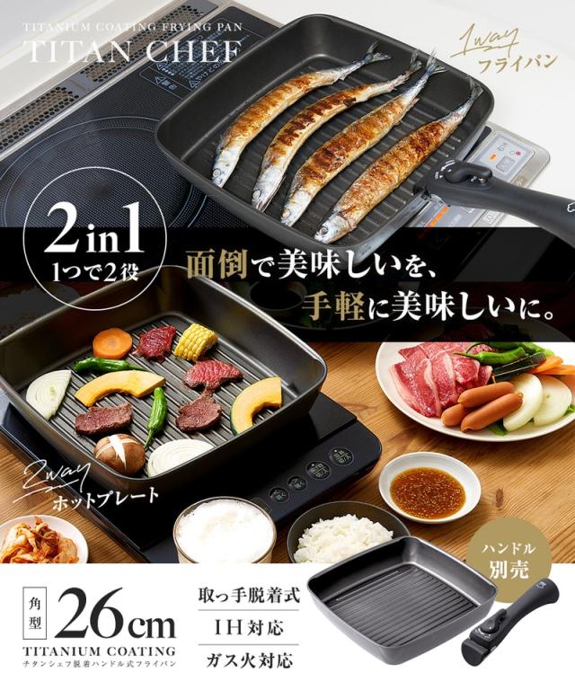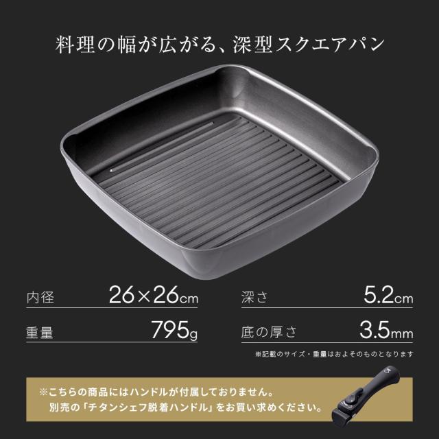 四角いフライパン 深型 26cm チタンシェフ 脱着ハンドル式 フライパン スクエア パン 取っ手が取れる 卵焼きフライパン 取っ手 取る 外せる 四角 ガス火 ih対応 くっつきにくい 焦げ付きにくい 着脱ハンドル式 調理器具 食洗機対応