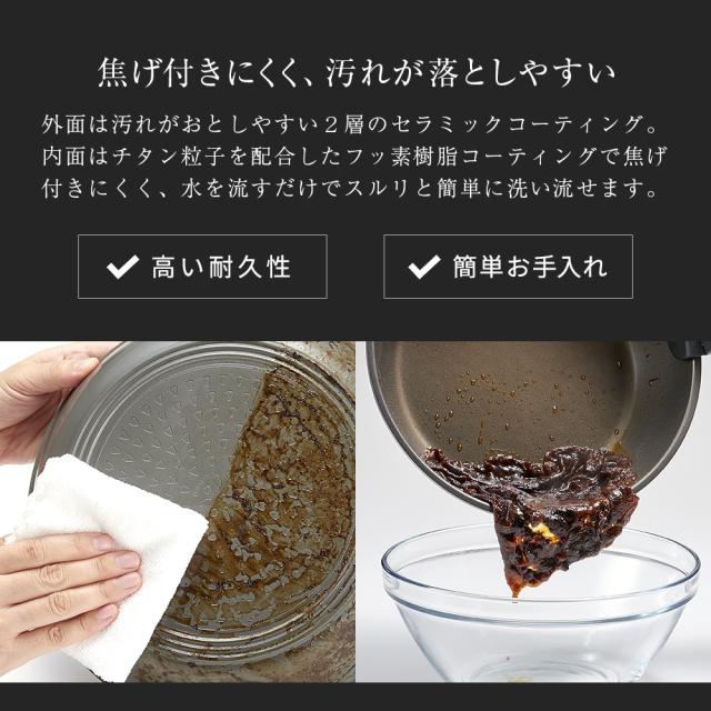 ロケットに使用されているチタン粒子配合コーティングだから、驚異の耐摩耗性テスト200万回クリア(※1)。内面3層・外面2層の多層コートで焦げ付きにくく、食洗機で洗えてお手入れも楽々。