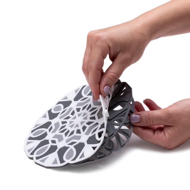 3枚をバラしてもそれぞれが複雑で美しい柄の鍋敷きです。3枚をパズルのように合わせると複雑で計算された模様の隙間から下になった模様が見える仕組みで、3枚重ねる事で美しい柄の鍋敷きが完成します。使わない時も3枚組み合わせる事で場所を取らずに収納できます。