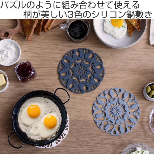 それぞれが美しい柄を持つ3色のシリコン製の鍋敷きはパズルのように、3枚を組み合わせて使う事で1つの美しい柄が出来上がります。普段は組み合わせて、鍋やフライパンを沢山置きたい時は1枚ずつにバラしてお使い頂けます。