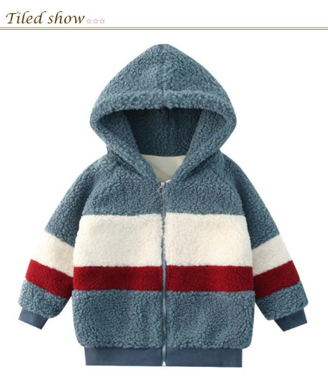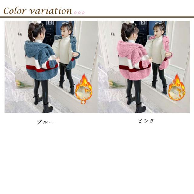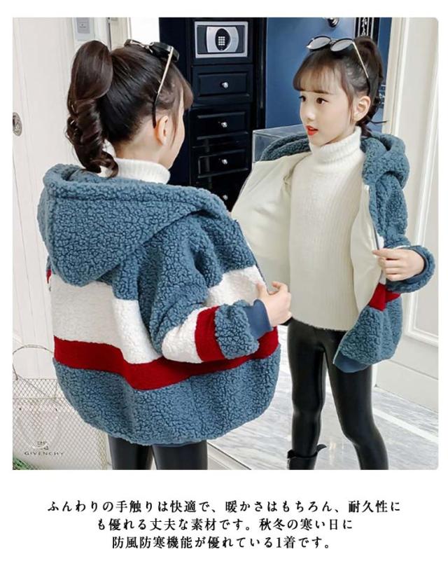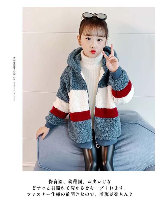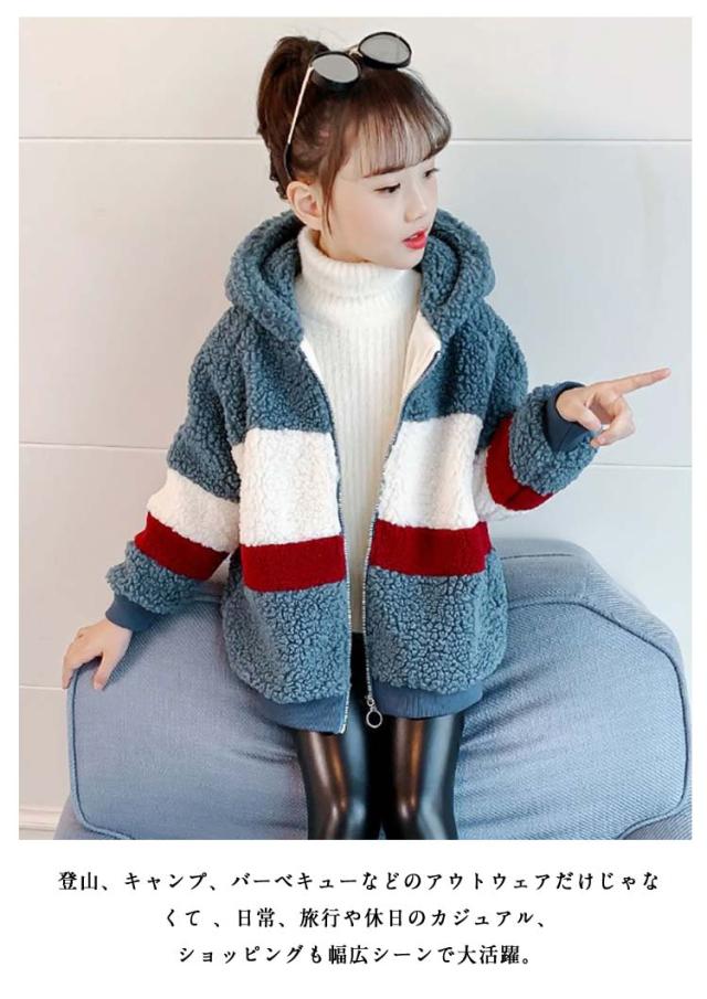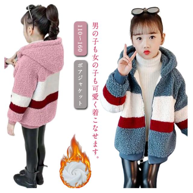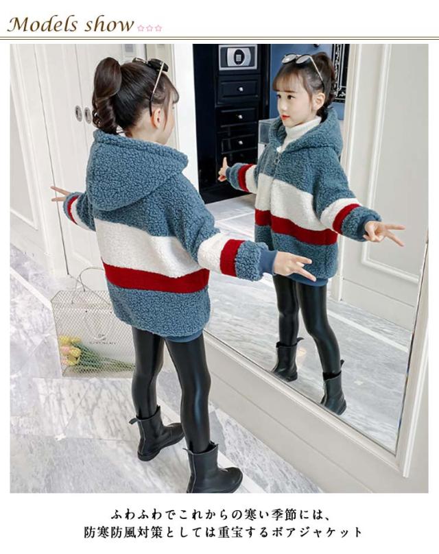 ボアジャケット キッズ フリース 子供 ジュニア ボーイズ ガールズ 秋冬 あったか 厚手 ボーダー柄 防寒着 アウター ファー ボリューム ボア ジャケット 子供服 ボアコート ファージャケット フード付き ジップアップ 通学 ギフト プレゼント 送料無料