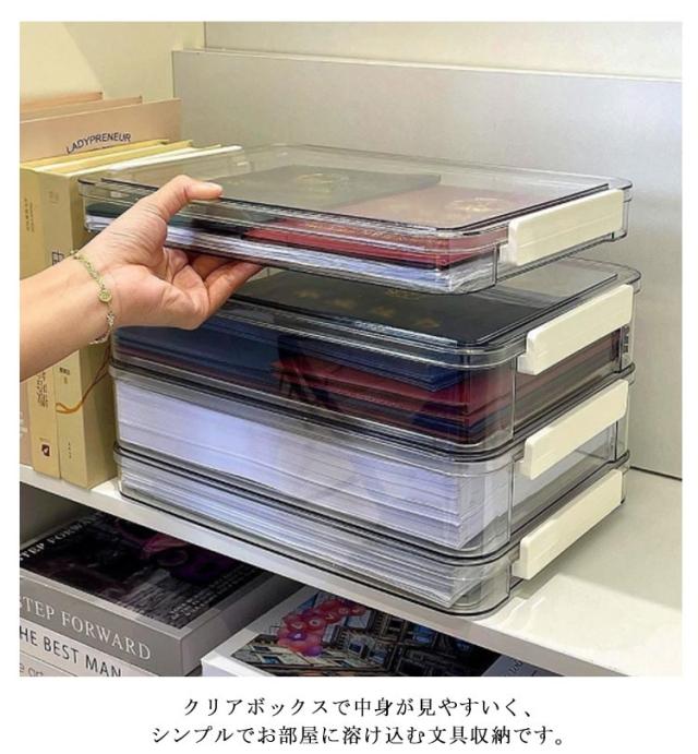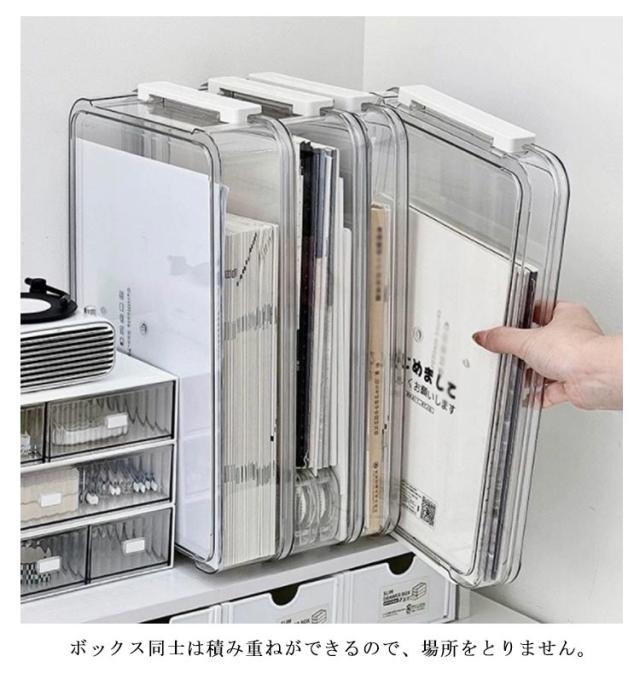 | 選べる2サイズ!厚みがあり量の多い書類や小物の整理などに便利な、ファイルボックス ファイル、プリント、書類、CD・DVD、メモや付箋、小物などがすっぽり入ります。 蓋付きでほこりやゴミが付きにくいです。 クリアボックスで中身が見やすいく、シンプルでお部屋に溶け込む文具収納です。 厚みがあり、しっかりした丈夫なつくりです。 ボックス同士は積み重ねができるので、場所をとりません。 | |