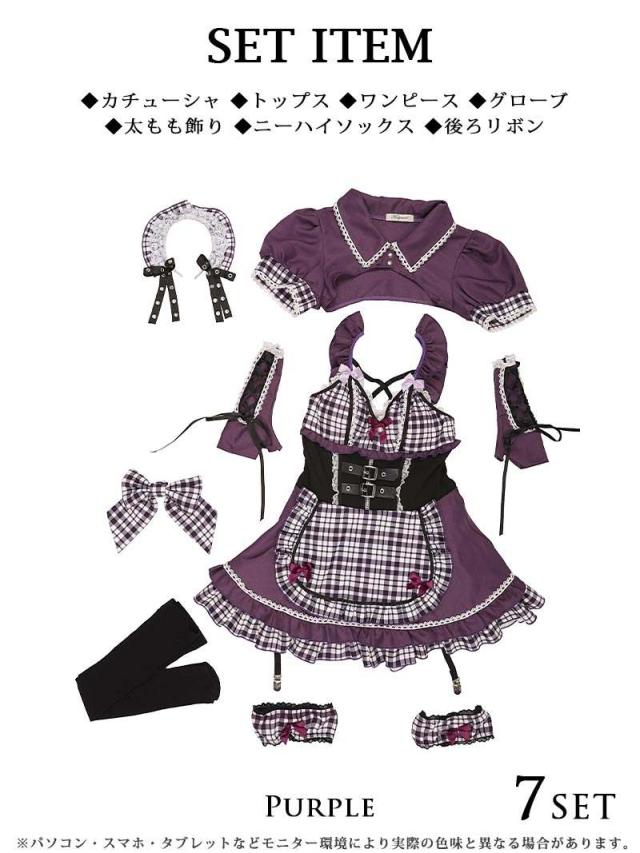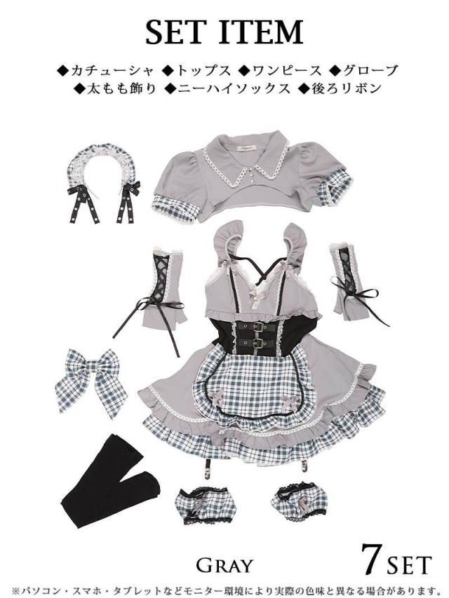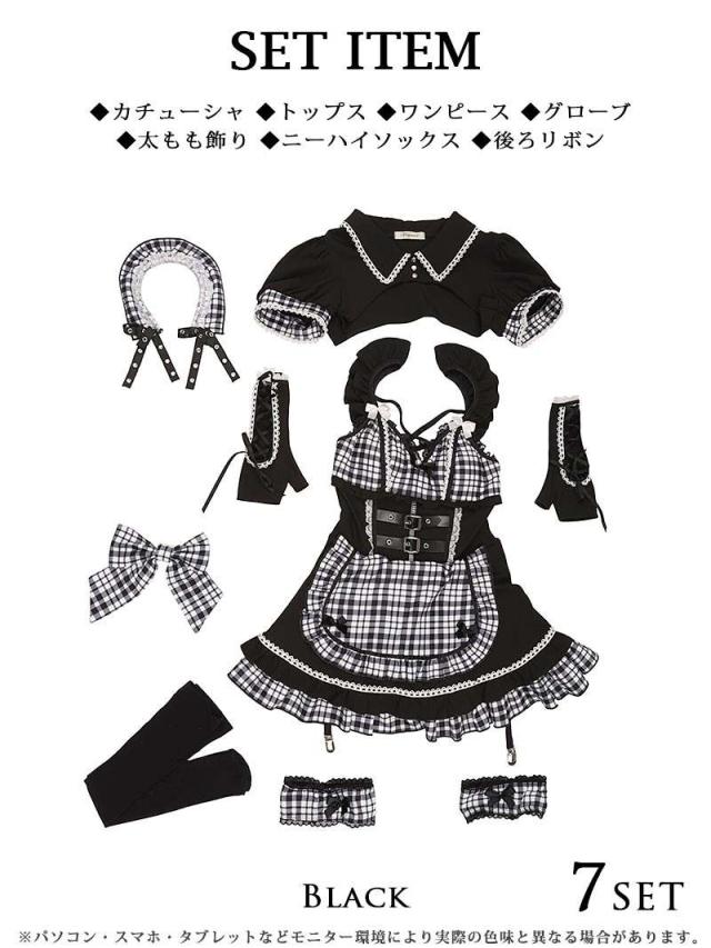 セット内容:カチューシャ・トップス・ワンピース・グローブ・太もも飾り・ニーハイソックス・後ろリボン