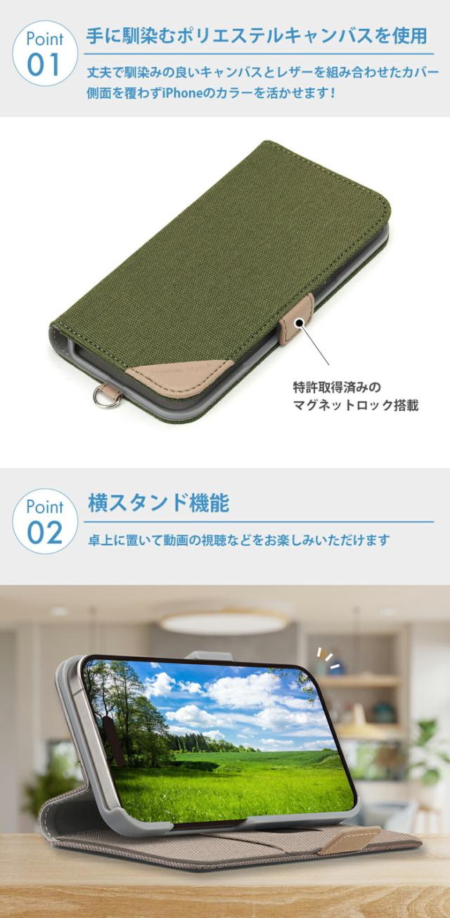カジュアルでお洒落なキャンバス生地は、シンプルなiPhoneのデザインとぴったりマッチします。