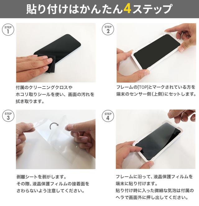 フィルムの貼り付けに便利なガイドフレーム・ほこり取りシール・クリーニングクロスの「貼り付けキット」が付属しています。