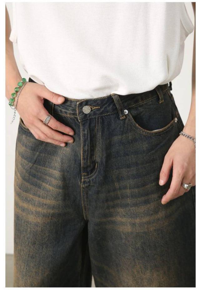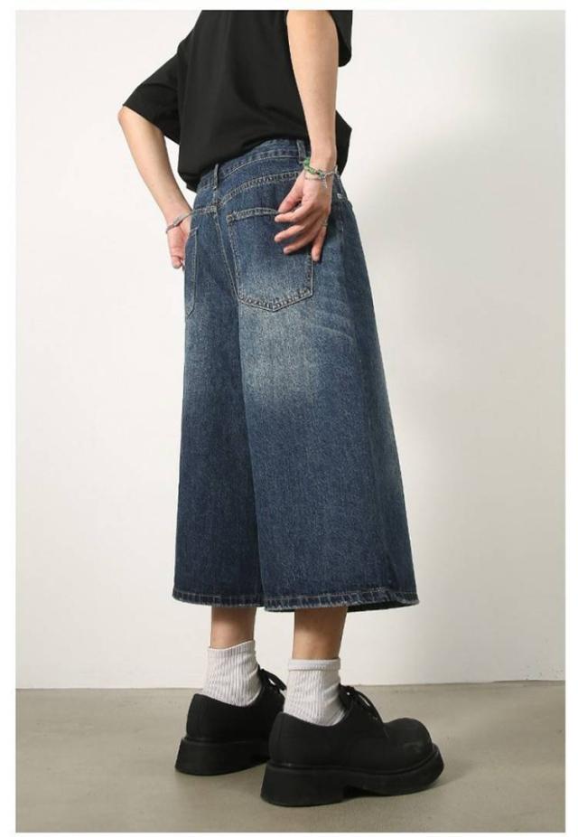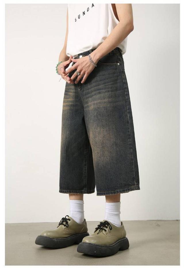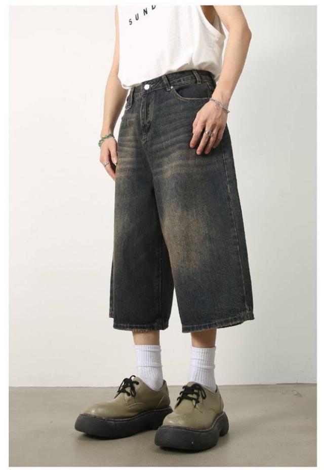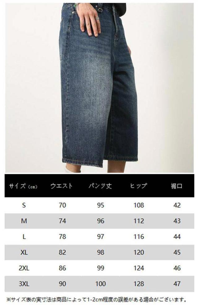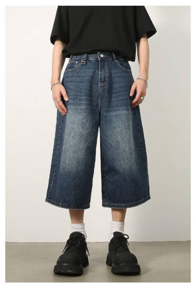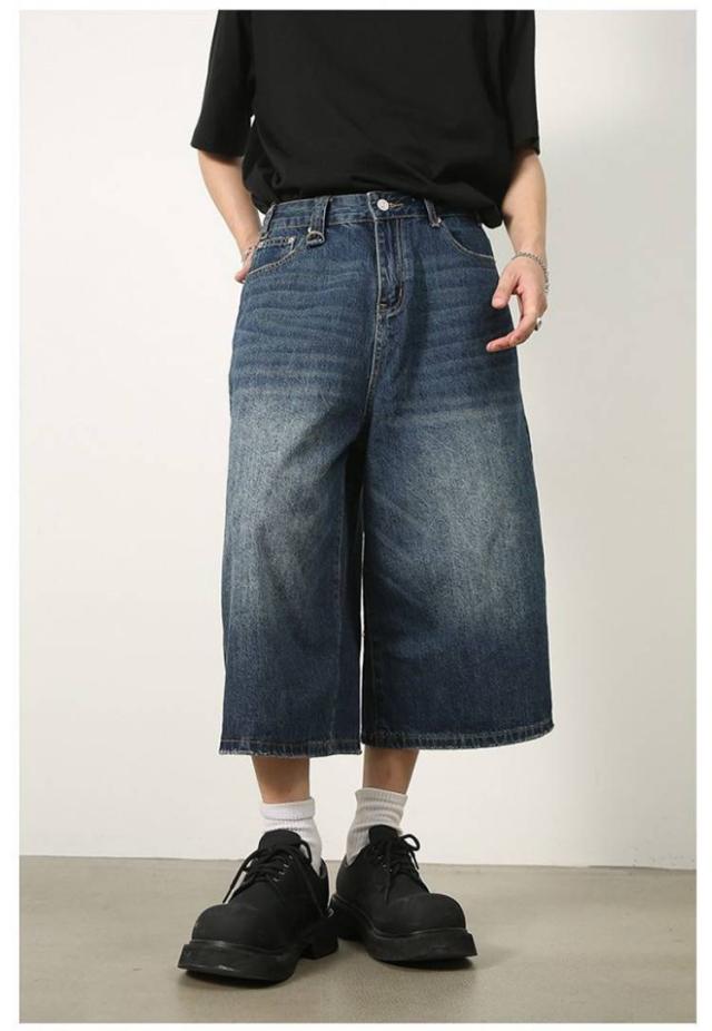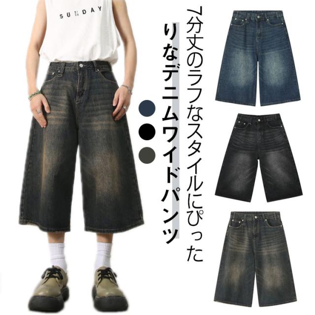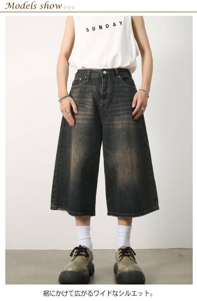 メンズ 体型カバー デニムパンツ ワイドパンツ ハーフパンツ ジーパン ジーンズ ヴィンテージ風 7分丈 膝下 ひざ下 クロップドパンツ ストリート系 ヒップホップ 個性派 衣装 おしゃれ カッコイイ 大きいサイズ デニムパンツ カジュアル