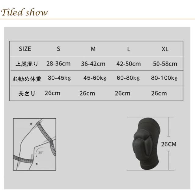 | S/M/L/XL 2枚セット 膝サポーター 2.5cm超極厚の衝撃吸収材 激しい運動でもしっかりサポート 膝の負担を軽減! <お勧めポイント> ●極厚EVAスポシジ ●毛玉が発生しにくい ●通気性のある生地 ●高品質の仕上げ 超極厚の衝撃吸収材 厚さ約2.5cmの衝撃吸収素材発泡EVAがしっかり衝撃を分散&吸収! 高い衝撃吸収能力により転倒時に保護効果を発揮して怪我防止に役立ちます。 膝のお皿全体をしっかりとカバー 大きめのパッドなので膝のお皿全体をしっかりとカバー。膝のケガ予防にとっても安心です。 様々な場面で使える!スポーツでも、お仕事でも大活躍 様々な場面でご利用いただいております。スポーツでの衝撃からのケガの予防や、しゃがんで膝を付いてお仕事をするときの膝頭の痛みを軽減します。 快適に着用できるムレにくい素材 特殊メッシュ加工をすることによりバツグンの通気性を実現。 サポーター本体は肌触りの良いポリエステル素材で通気性と伸縮性に優れているので長時間の装着でも不快感がありません。オールシーズン使用可能! いつでも清潔に洗って使える パッドは手洗いで洗濯できます。野外の使用で汚れても、汗をかいても安心です。 | |
