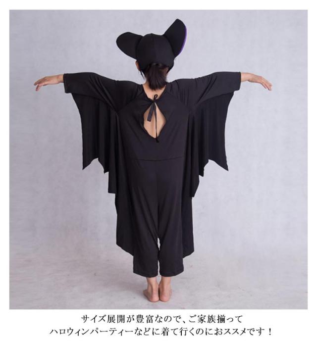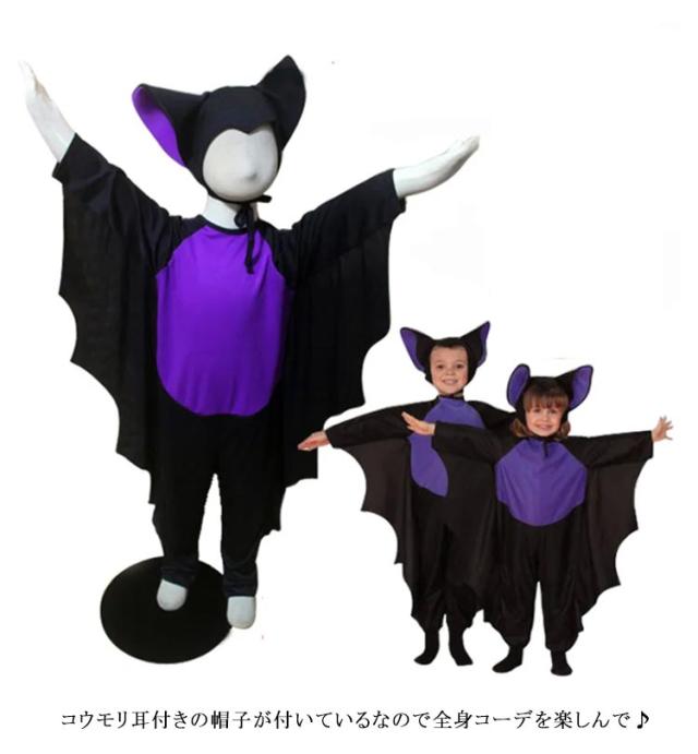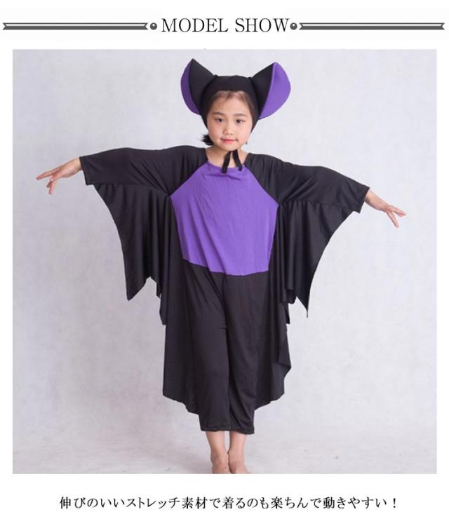 | 100〜180cm! コウモリをイメージしたハロウィン仮装! 伸びのいいストレッチ素材で着るのも楽ちんで動きやすい! コウモリ耳付きの帽子が付いているなので全身コーデを楽しんで♪ サイズ展開が豊富なので、ご家族揃ってハロウィンパーティーなどに着て行くのにおススメです! | |