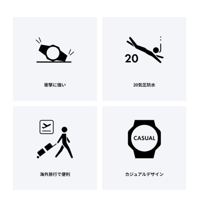 20気圧防水やワールドタイム、ストップウオッチなどの便利な機能も充実。