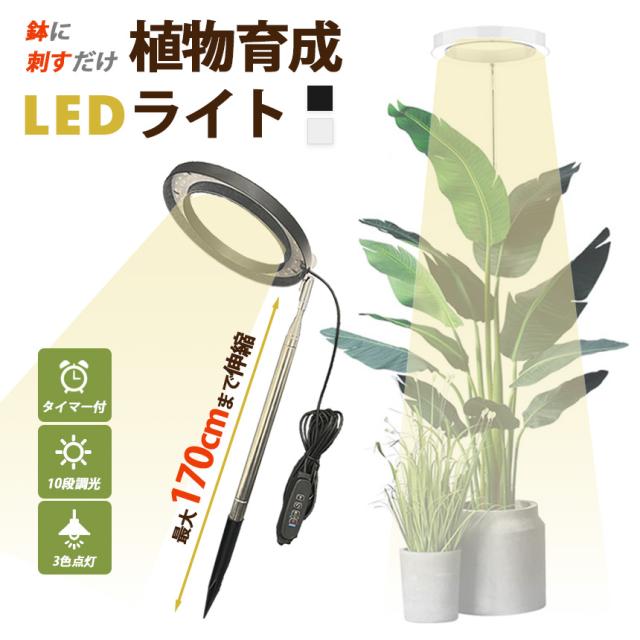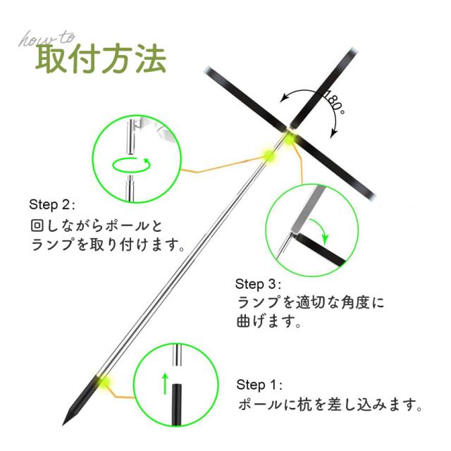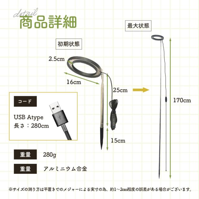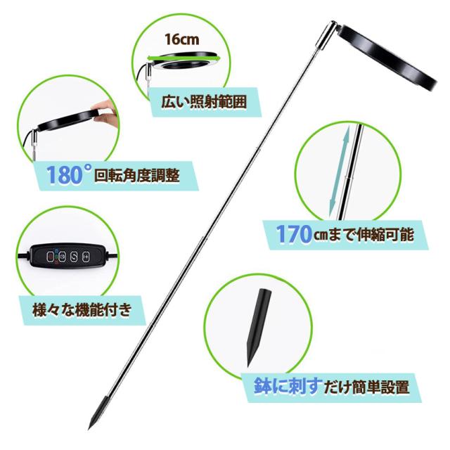 広い照射範囲 / 180度回転角度調整 / 様々な機能付き / 170cmまで伸縮可能 / 鉢に刺すだけ簡単設置