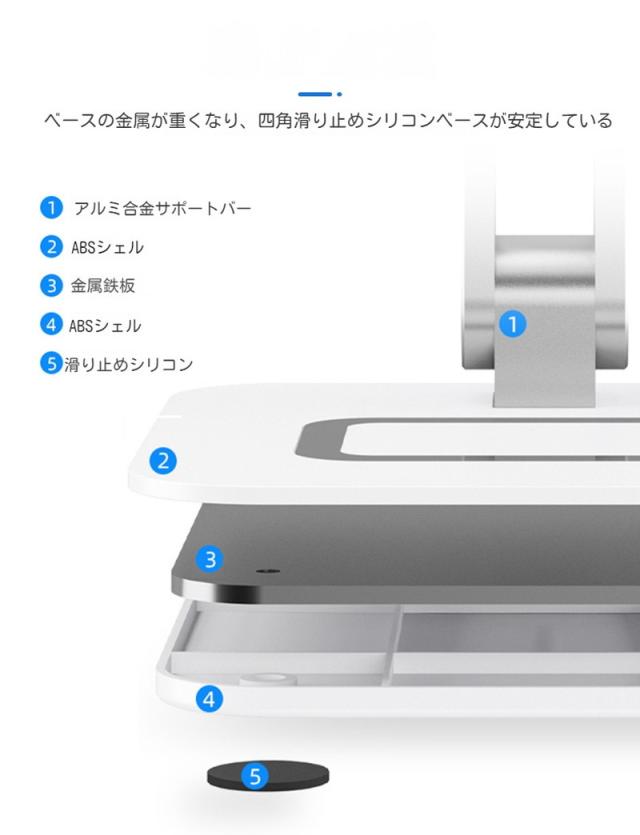 【高品質素材】ありがちなプラスチック製のものより、こちらのスタンドは品質の高いアルミ合金製です。台座の底に滑り止めマット付き、重量があるためタブレットを載せてもしっかりとホールドしますので、タッチ操作なども安定して行えます。ケーブル