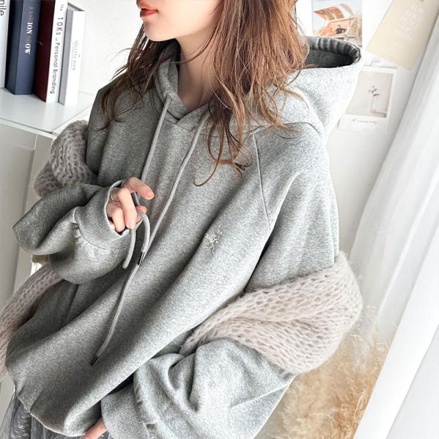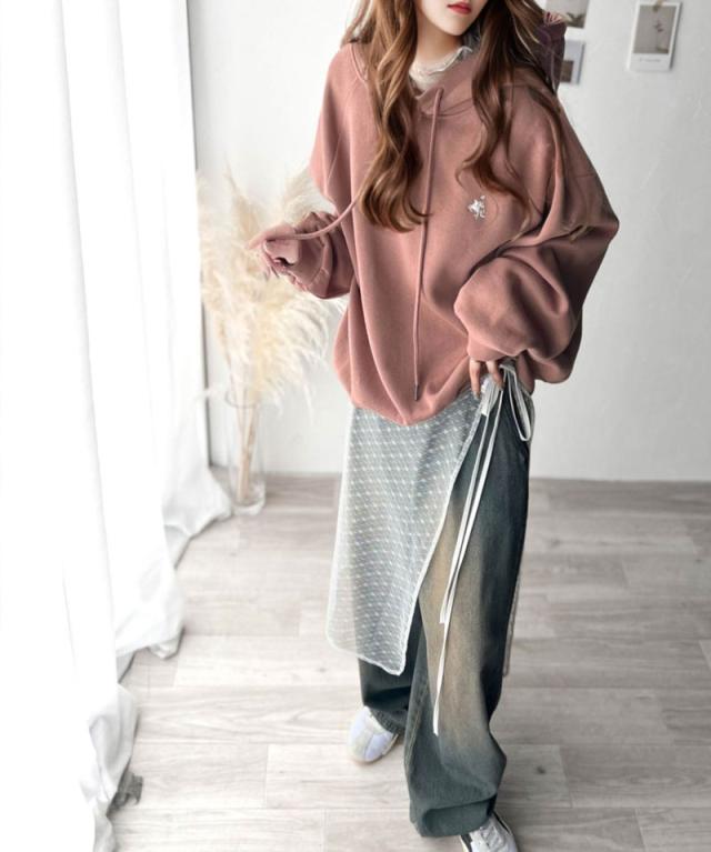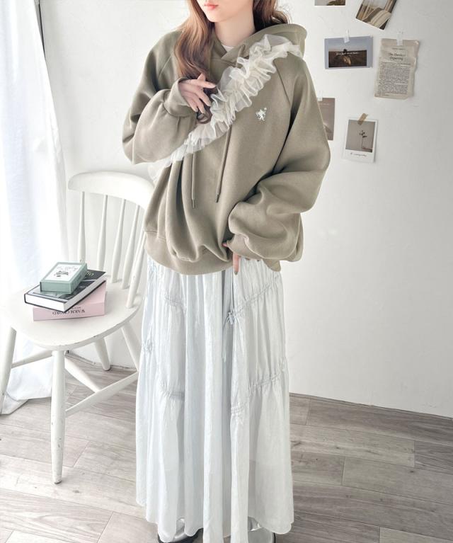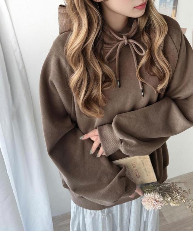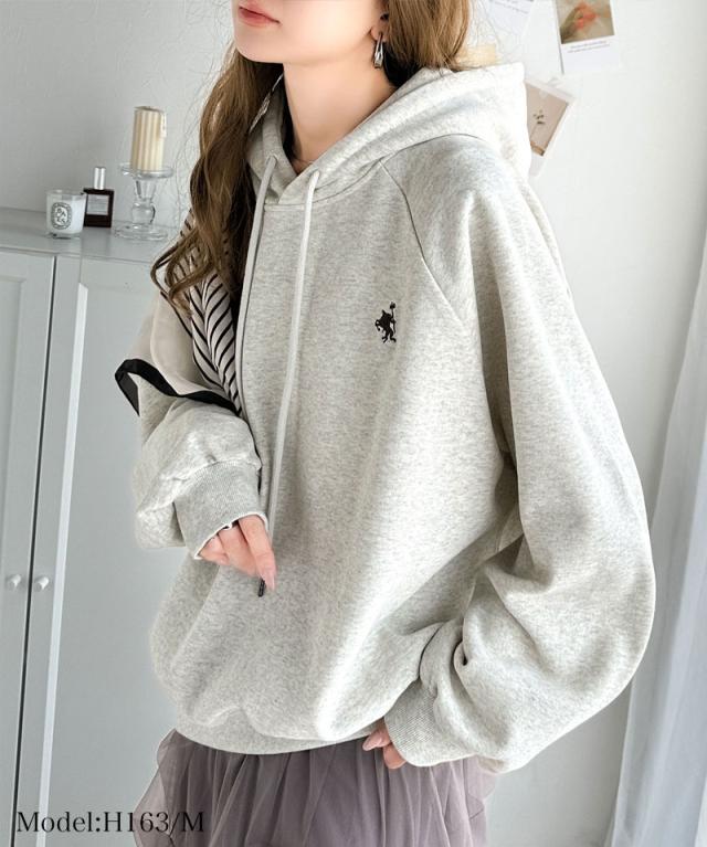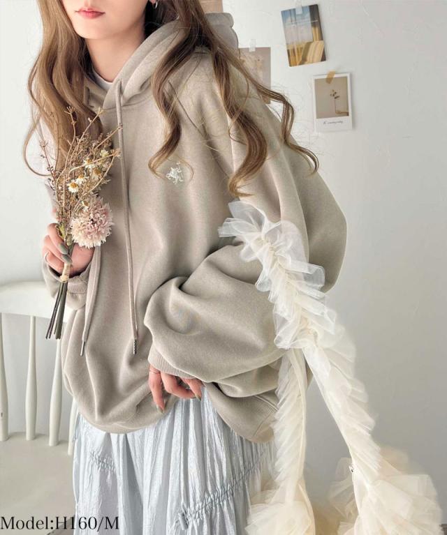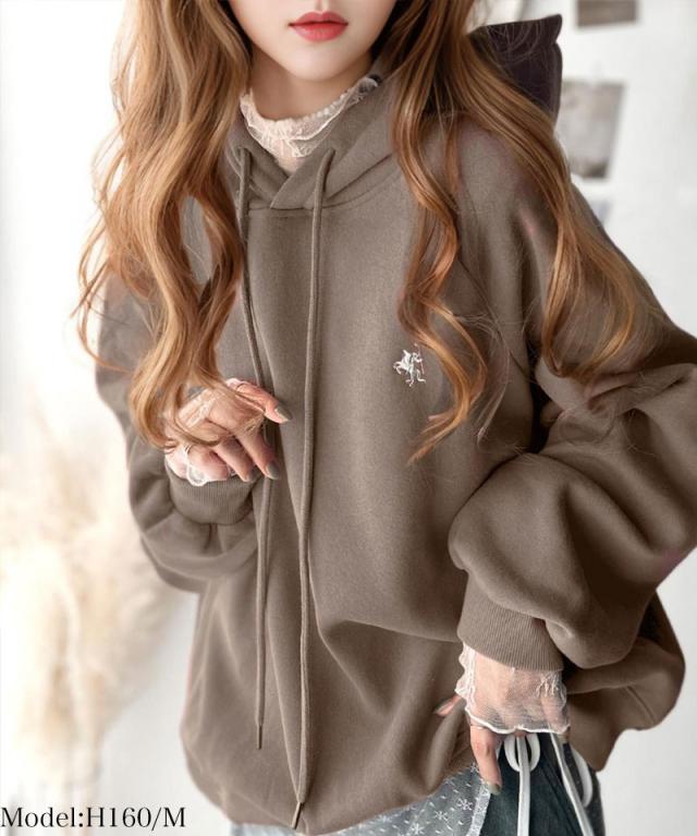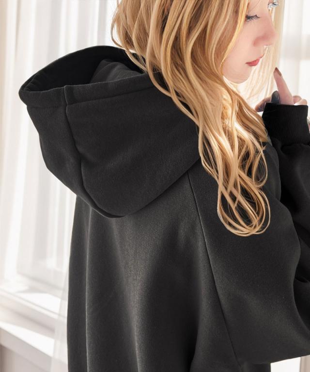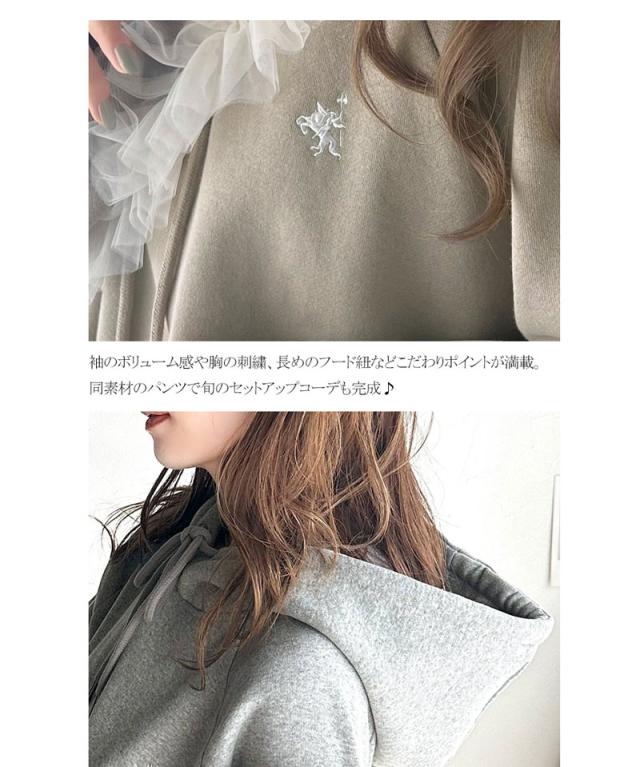 袖のボリューム感や胸の刺繍、長めのフード紐などこだわりポイントが満載。