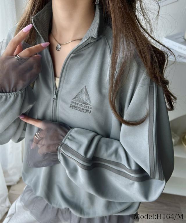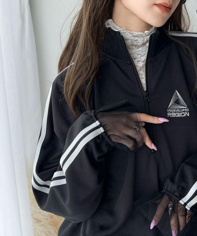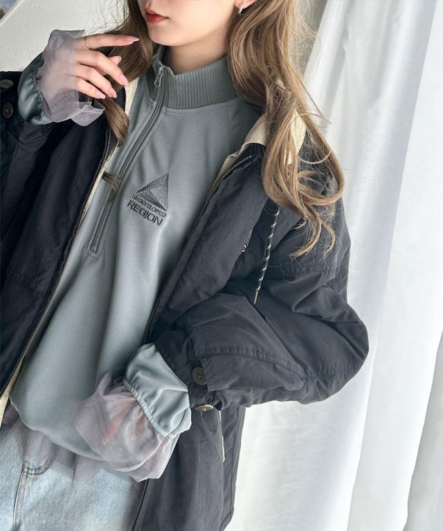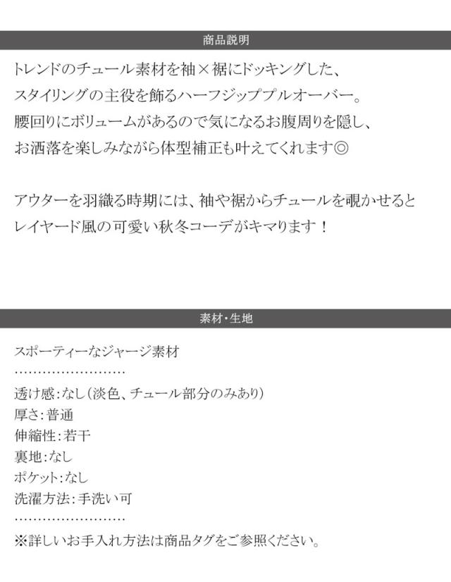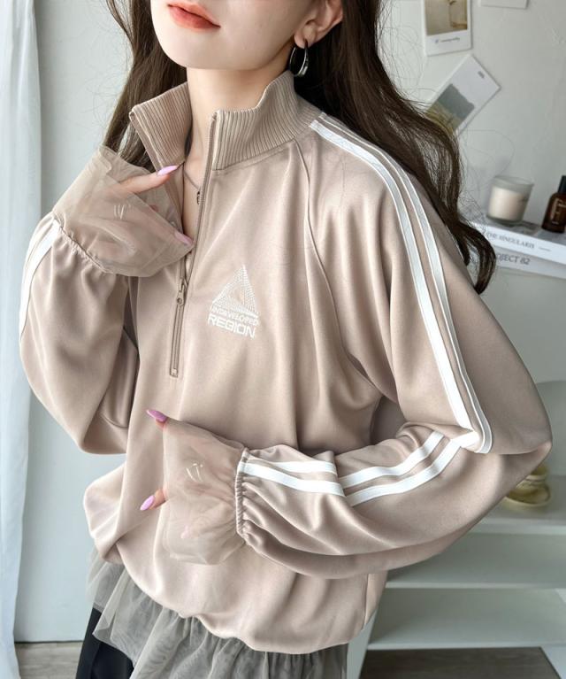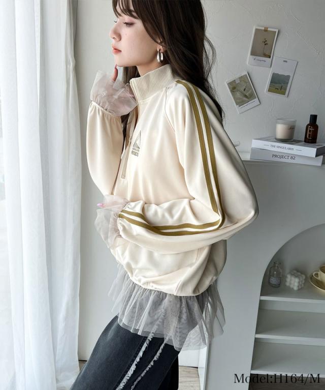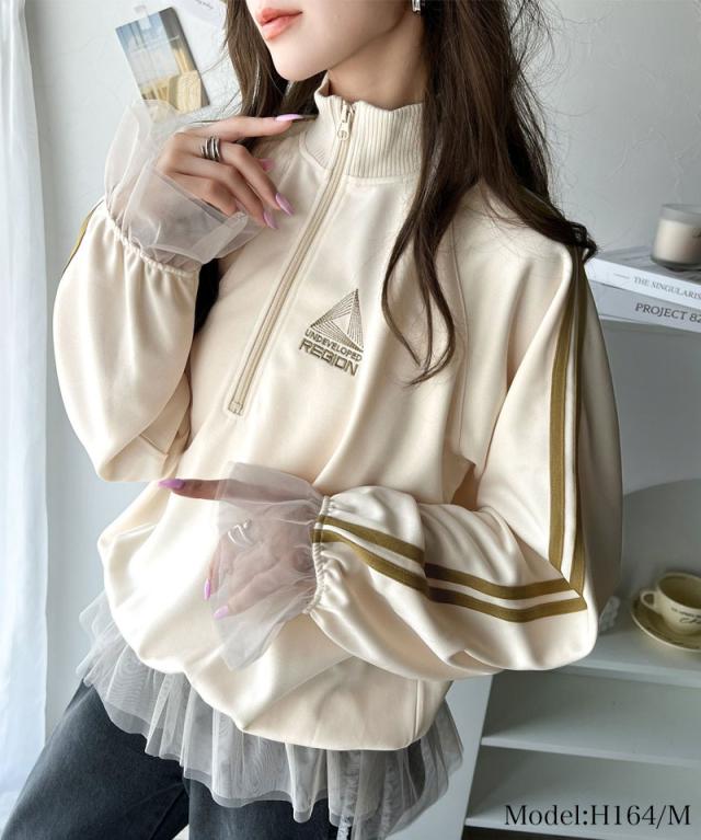 ★スポーティ×ガーリーな1軍トップス。ワンポイント胸刺繍チュールコンビハーフジップアノラックプルオーバー★