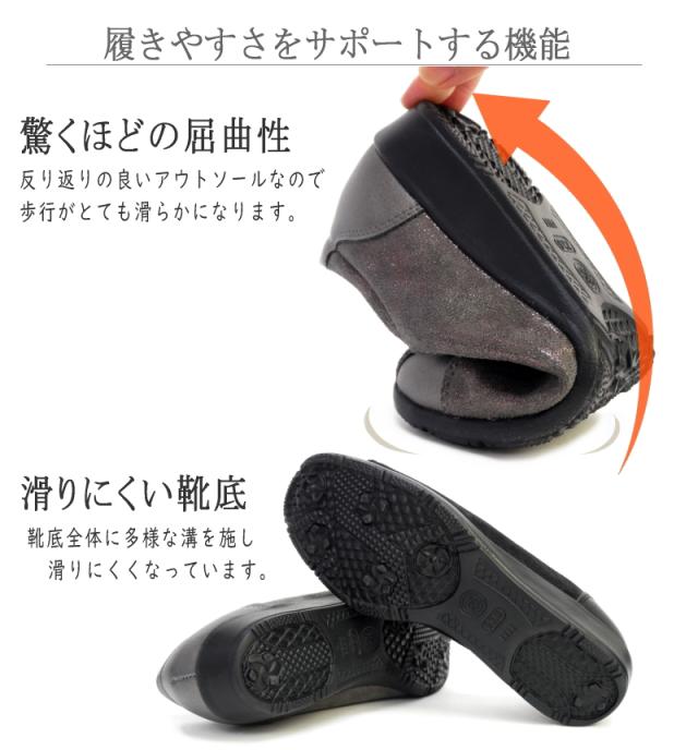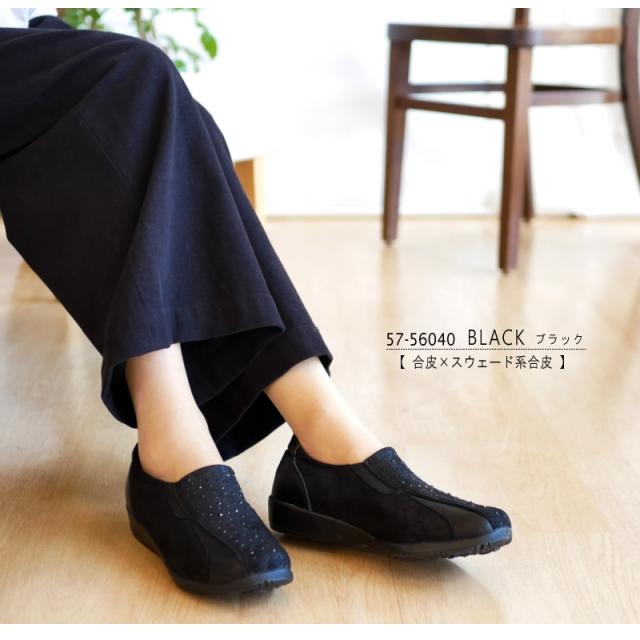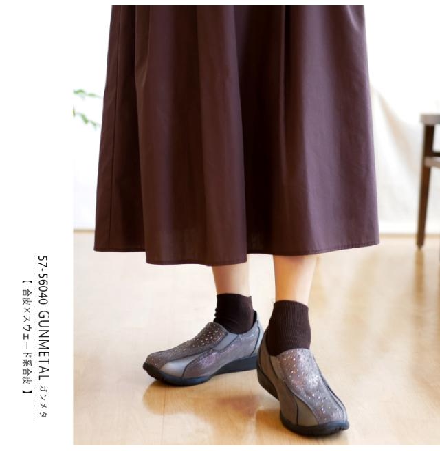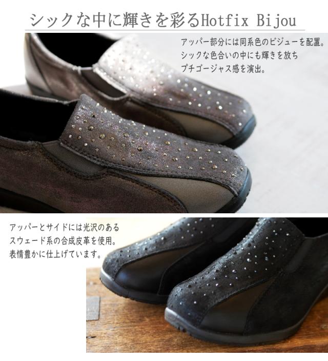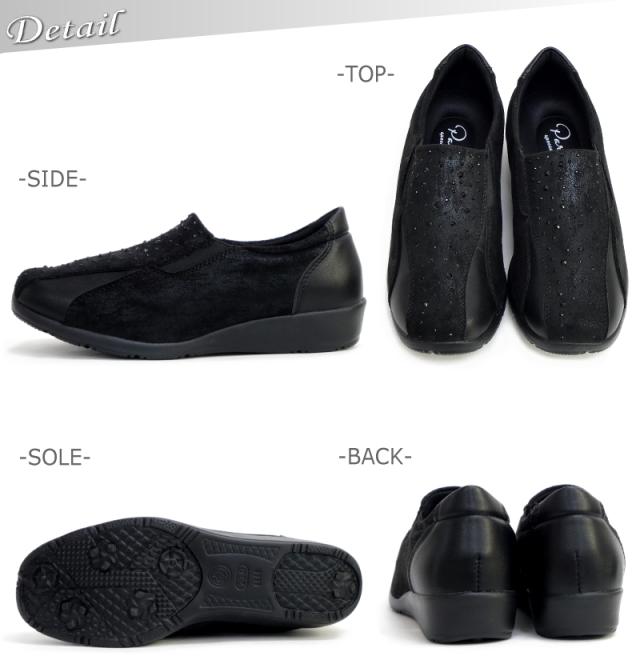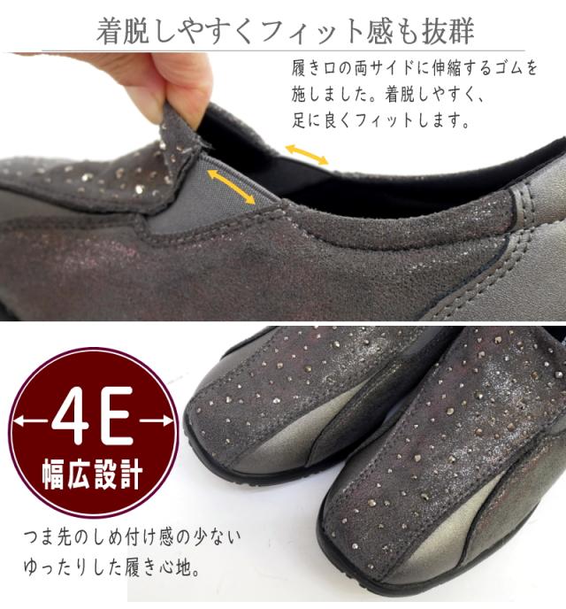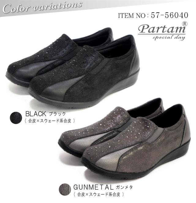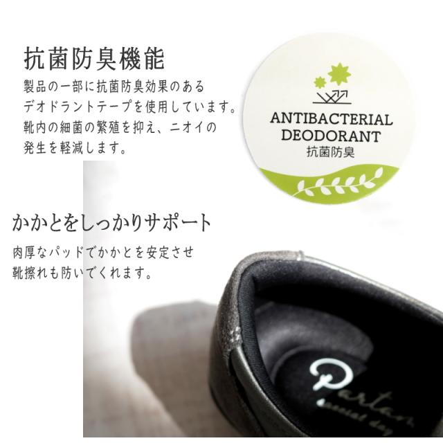 PARTAM パータム スリッポンシューズ 靴 レディース サイドゴム スタッズ ビジュー 4e 幅広設計 抗菌防臭 フラットソール スクエアトゥ 軽量 黒 ガンメタ 柔らかい 滑りにくい 屈曲