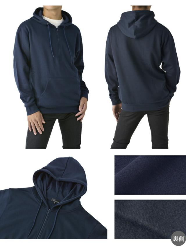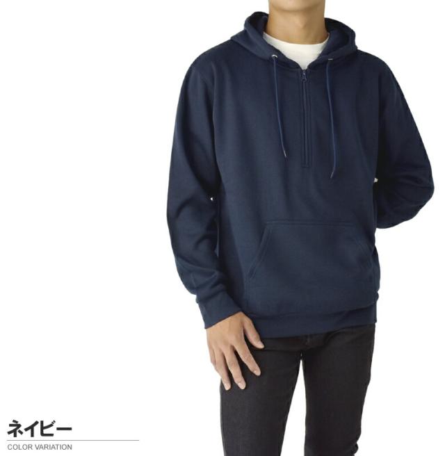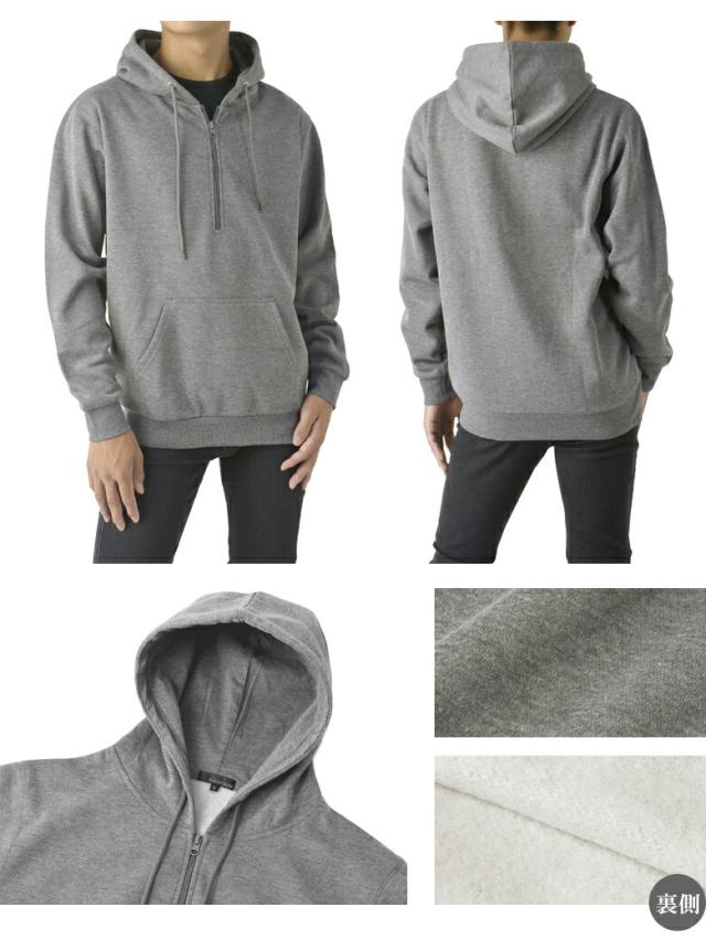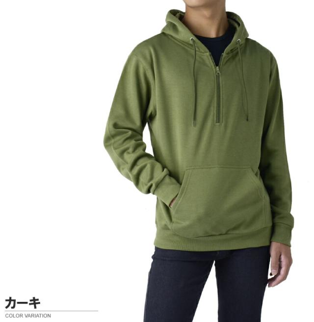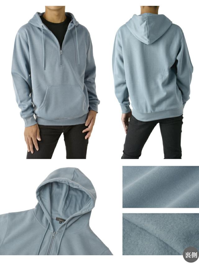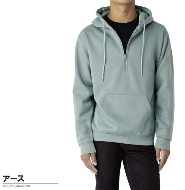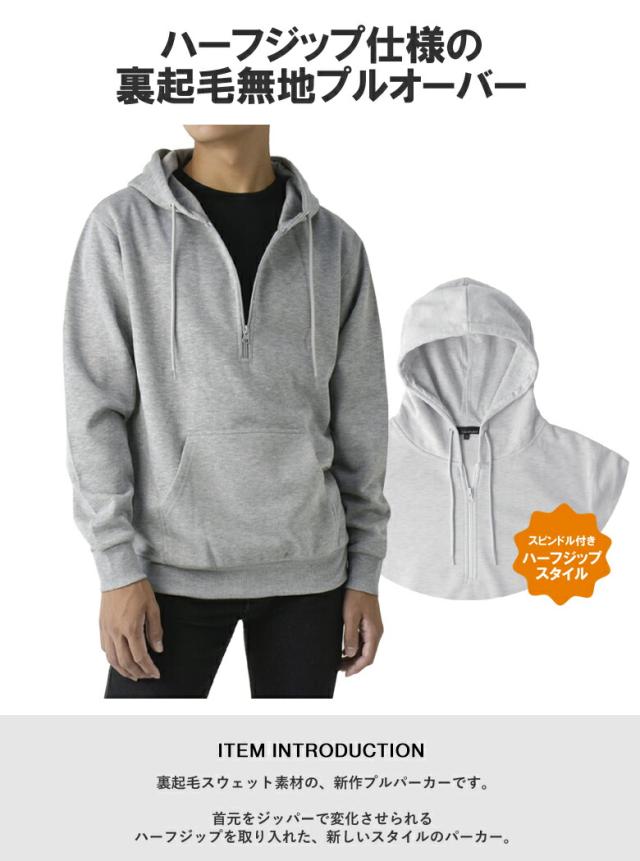 送料無料☆ハーフジップ仕様の裏起毛無地プルパーカーです。
