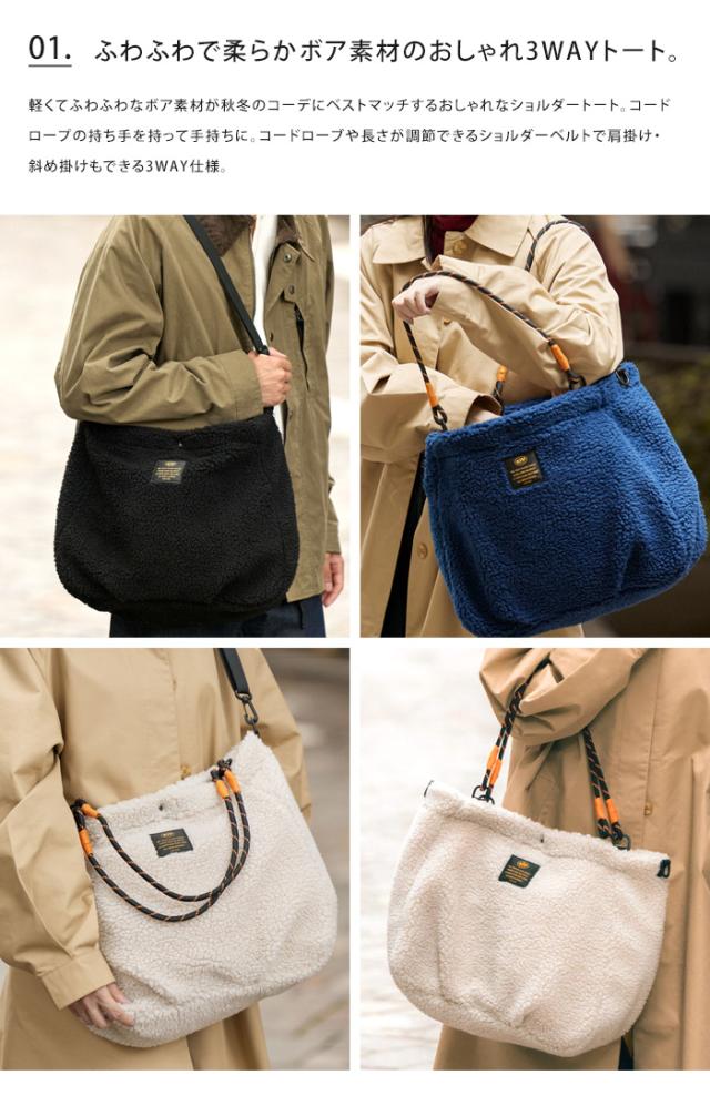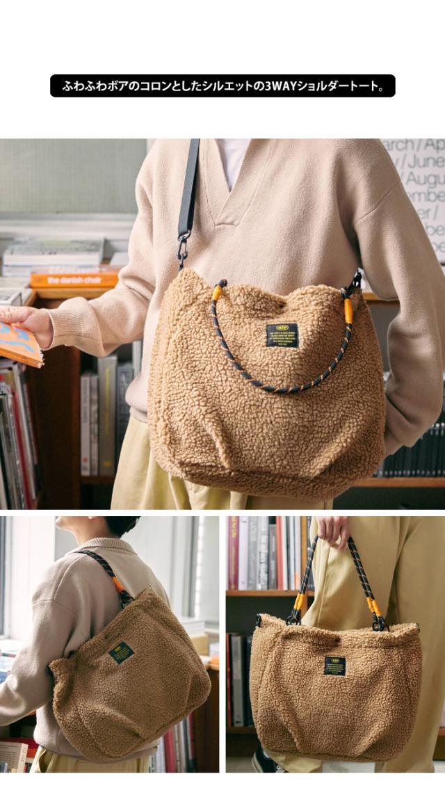 軽くてふわふわなボア素材が秋冬のコーデにベストマッチするおしゃれなショルダートート。コードロープの持ち手を持って手持ちに。コードローブや長さが調節できるショルダーベルトで肩掛け・斜め掛けもできる3WAY仕様。軽くてふわふわなボア素材が秋冬のコーデにベストマッチするおしゃれなショルダートート。コードロープの持ち手を持って手持ちに。コードローブや長さが調節できるショルダーベルトで肩掛け・斜め掛けもできる3WAY仕様。