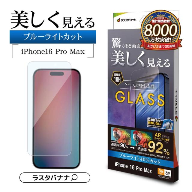 iPhone16 Pro Max ガラスフィルム 平面保護 低反射 ブルーライトカット 高光沢 ARコーティング ガイド枠付き ARE4489IP467P ラスタバナナ
