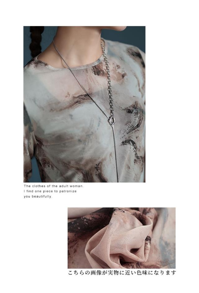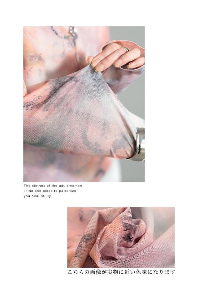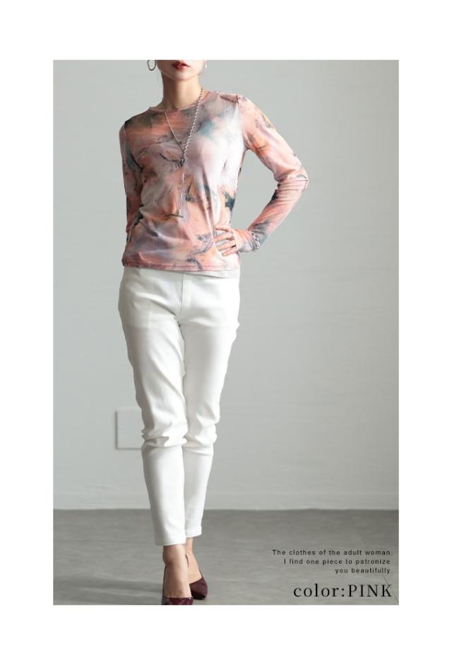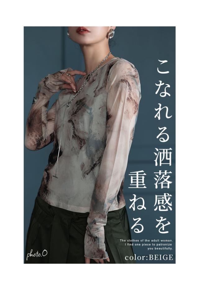 春新作 モードな洒落感際立つマーブル柄チュールトップス レディース ファッション トップス カットソー マーブル 総柄 チュール シアー インナー クルーネック 30代 40代 50代 60代 サワアラモード sawaalamode otona 大人 cawaii 可愛い 洋服 かわいい服 aldt-401f2006