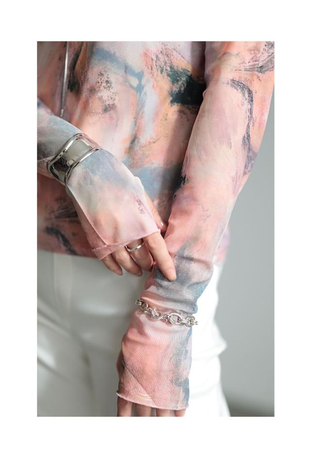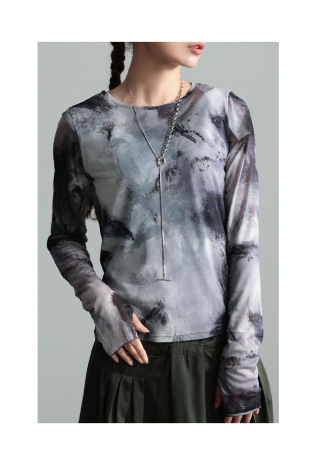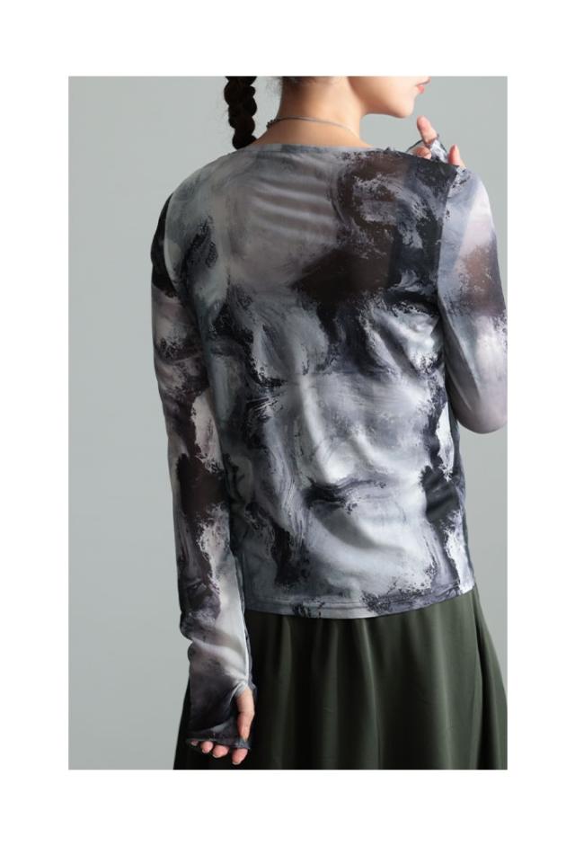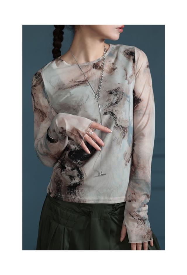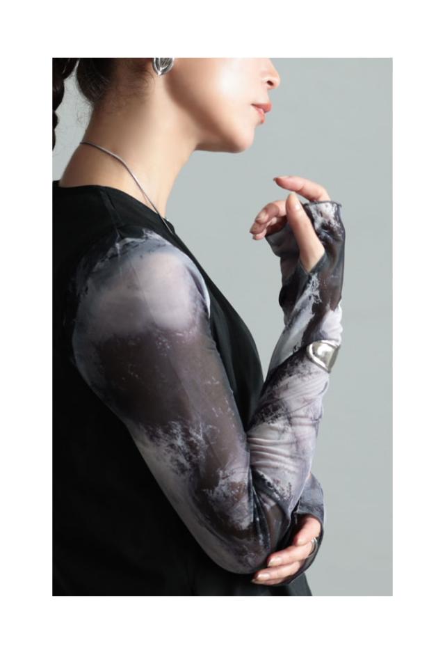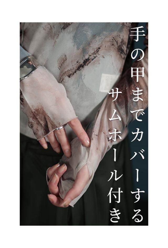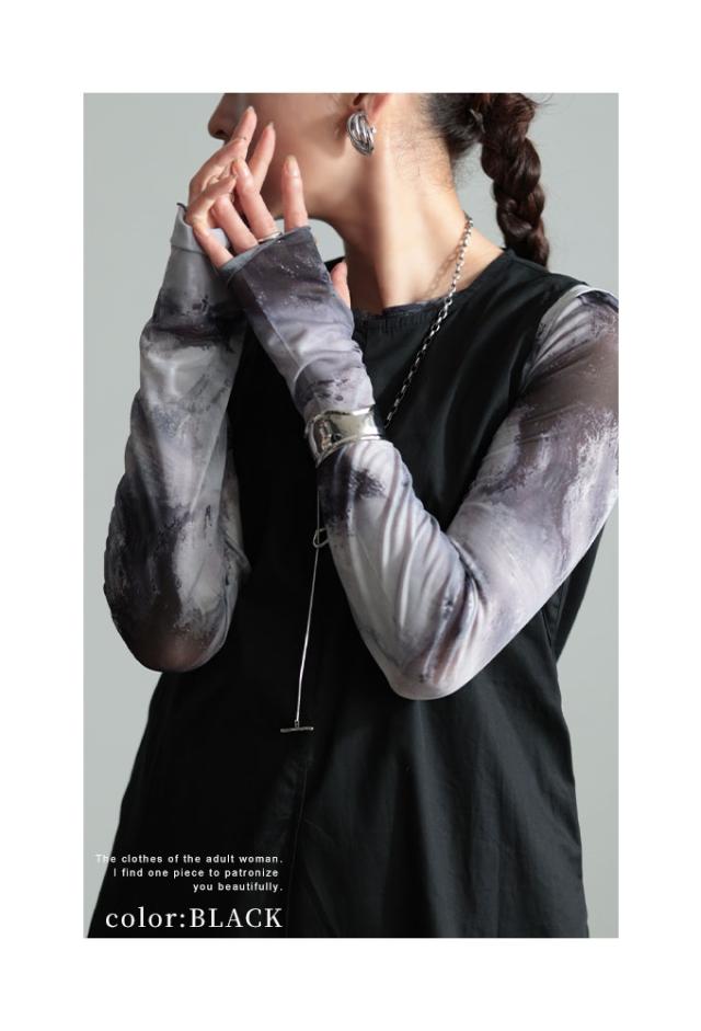 特徴: マーブル 総柄 チュール シアー クルーネック サムホール 指穴