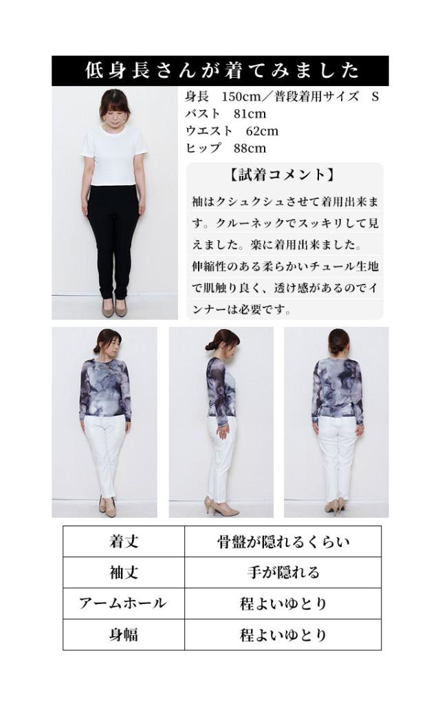 着丈は骨盤が隠れるくらいです。袖は伸ばすと手が隠れますがクシュクシュさせて手の甲くらいで着用出来ます。クルーネックでスッキリして見えました。脇グリも身幅も程よい余裕があり楽に着用出来ました。伸縮性のある柔らかいチュール生地で肌触り良く着心地良かったです。透け感があるのでインナーは必要です。